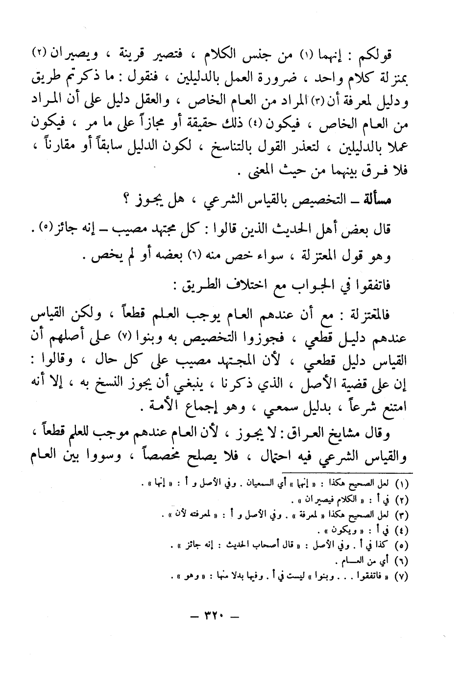 فالمعتزلة: مع أن عندهم العام يوجب العلم قطعاً، ولكن القياس عندهم دليل قطعي، فجوزوا التخصيص به وبنوا (¬7) على أصلهم أن القياس دليل قطعي، لأن المجتهد مصيب على كل حال، وقالوا: إن على قضة الأصل، الذي ذكرنا، ينبغي أن يجوز النسخ به، إلا أنه امتنع شرعاً، بدليل سمعي، وهو إجماع الأمة.