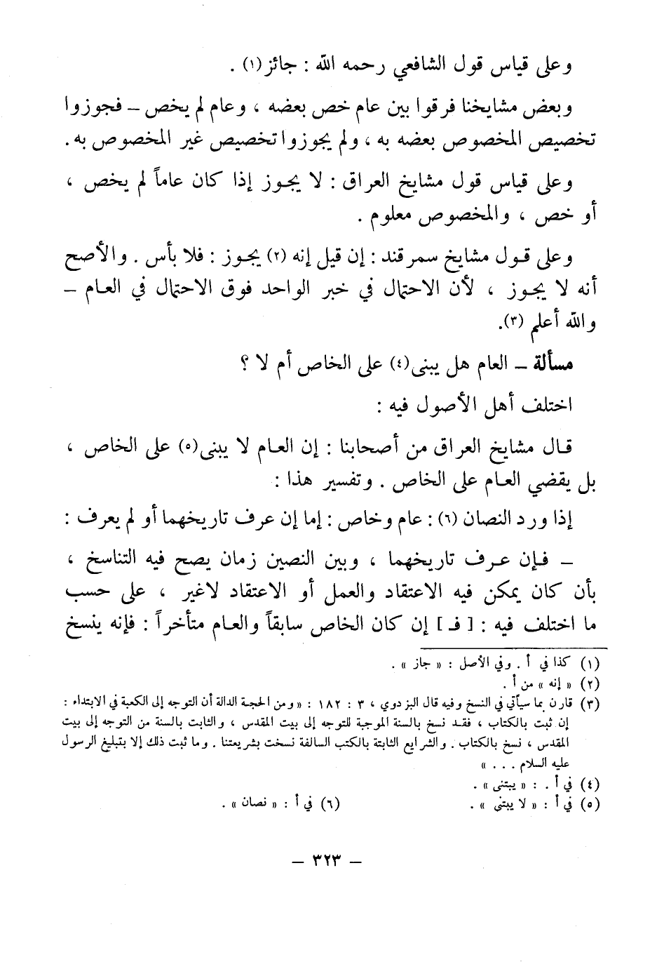 قال مشايخ العراق من أصحابنا: إن العام لا يبنى (¬5) على الخاص، بل يقضي العام على الخاص. وتفسير هذا: