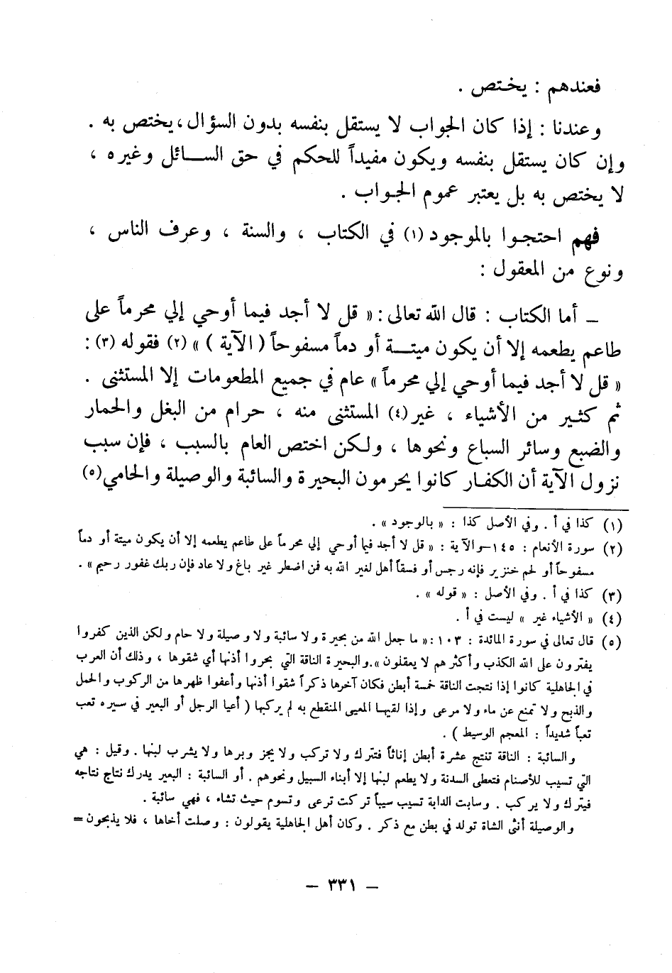 - أما الكتاب: قال الله تعالى: "قل لا أجد فيما أوحي إلي محرماً على طاعم يطعمه إلا أن يكون ميتة أو دماً مسفوحاً (الآية) " (¬2) فقوله (¬3): "قل لا أجد فيما أوحي إلي محرماً" عام في جميع المطعومات إلا المستثني. ثم كثير من الأشياء، غير (¬4) المستثنى منه، حرام من البغل والحمار والضبع وسائر السباع ونحوها، ولكن اختص العام بالسبب فإن سبب نزول الآية أن الكفار كانوا يحرمون البحيرة والسائبة والوصيلة والحامي (¬5)