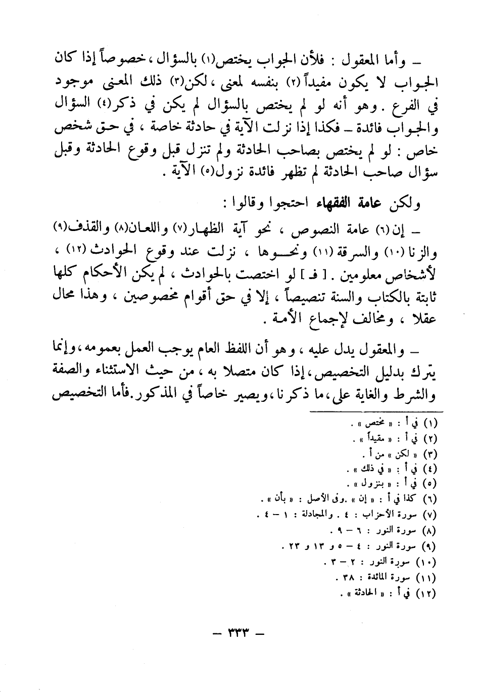 - إن (¬6) عامة النصوص، نحو آية الظهار (¬7) واللعان (¬8) والقذف (¬9) والزنا (¬10) والسرقة (¬11) ونحوها، نزلت عند وقوع الحوادث (¬12)، لأشخاص معلومين. [فـ] لو اختصت بالحوادث، لم يكن الأحكام كلها ثابتة بالكتاب والسنة تنصيصاً، إلا في حق أقوام مخصوصين، وهذا محال عقلا، ومخالف الإجماع الأمة.