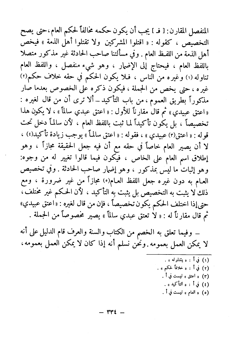 المنفصل المقارن: [فـ] يجب أن يكون حكمه مخالفاً لحكم العام، حتى يصح التخصيص، كقوله: "اقتلوا المشركين ولا تقتلوا أهل الذمة" فيخص أهل الذمة من اللفظ العام. وفي مسألتنا صاحب الحادثة غير مذكور متصلا باللفظ العام، فيحتاج إلى الإضمار، وهو شيء منفصل، واللفظ العام تناوله (¬1) وغيره من الناس، فلا يكون الحكم في حقه خلاف حكم (¬2) غيره، حتى يخص من الجملة، فيكون ذكره على الخصوص بعدما صار مذكوراً بطريق العموم، من باب التأكيد - ألا ترى أن من قال لغيره: "اعتق عبيدي" ثم قال مقارناً للأول: "اعتق عبدي سالماً"، لا يكون هذا تخصيصاً، بل يكون تأكيداً لا ثبت باللفظ العام، لأن سالماً دخل تحت قوله: "اعتق (¬3) عبيدي"، فقوله: "اعتق سالماً" يوجب زيا دة تأكيد (¬4)، لا أن يصير العام خاصاً في حقه مع أن فيه جعل الحقيقة مجازاً، وهو إطلاق اسم العام على الخاص، فيكون فيما قالوا تغيير له من وجوه: وهو إثبات ما ليس بمذكور، وهو إضمار صاحب الحادثة. وفي تخصيص العام به دون غيره جعل اللفظ العام (¬5) مجازاً من غير ضرورة، ومع ذلك لا يثبت به التخصيص بل يثبت به التأكيد، لأن الحكم غير مختلف، حتى إذا اختلف الحكم يكون تخصيصاً، فإن من قالمالغيره: "اعتق عبيدي" ثم قال مقارناً له: "لا تعتق عبدي سالماً" يصير مخصوصاً من الجملة.