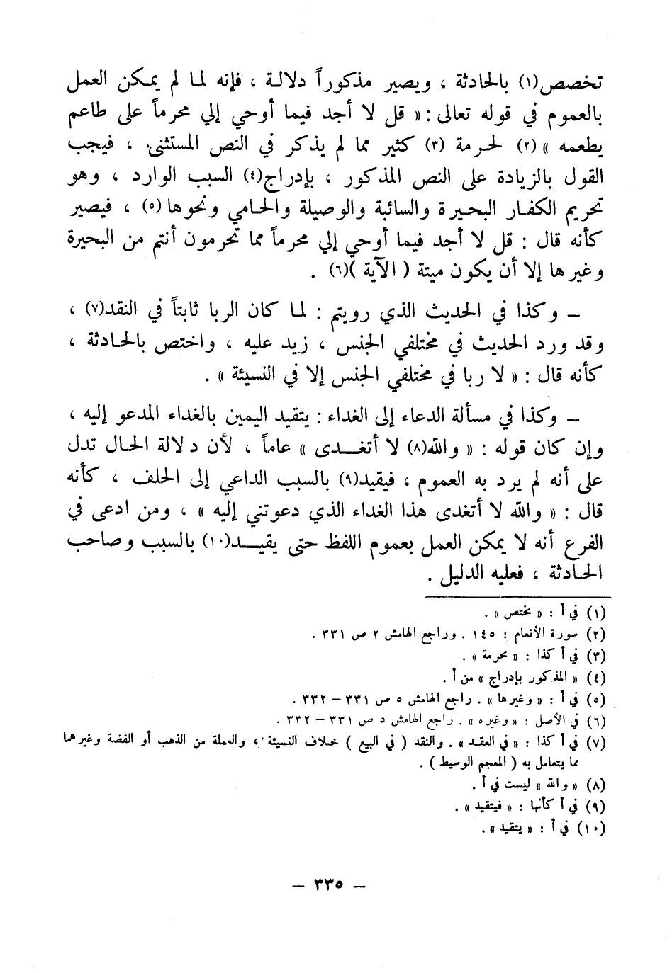 تخصص (¬1) بالحادثة، ويصير مذكوراً دلالة، فإنه لما لم يمكن العمل بالعموم في قوله تعالى: "قل لا أجد فيما أوحي إلي محرماً على طاعم يطعمه" (¬2) لحرمة (¬3) كثير مما لم يذكر في النص المستثنى، فيجب القول بالزيادة على النص المذكور، بإدراج (¬4) السبب الوارد، وهو تحريم الكفار البحيرة والسائبة والوصيلة والحامي ونحوها (¬5)، فيصير كأنه قال: قل لا أجد فيما أوحي إلي محرماً مما تحرمون أنتم من البحيرة وغيرها إلا أن يكون ميتة (الآية) (¬6).