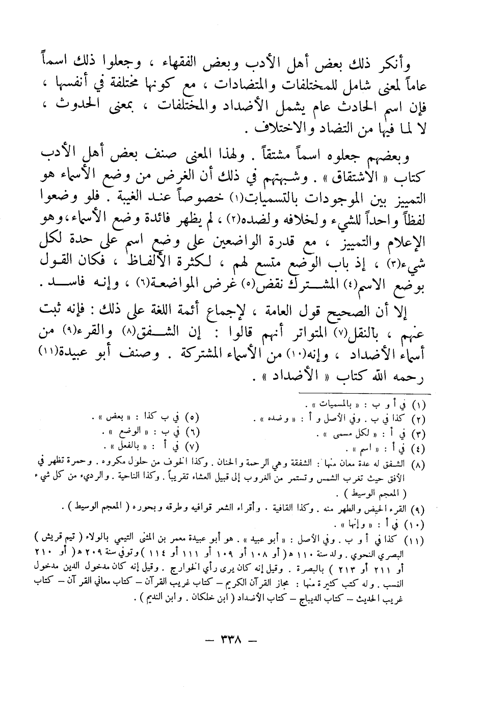 إلا أن الصحيح قول العامة، لإجماع أئمة اللغة على ذلك: فإنه ثبت عنهم، بالنقل (¬7) المتواتر أنهم قالوا: إن الشفق (¬8) والقرء (¬9) من أسماء الأضداد، وإنه (¬10) من الأسماء المشتركة. وصنف أبو عبيدة (¬11) رحمه الله كتاب "الأضداد".