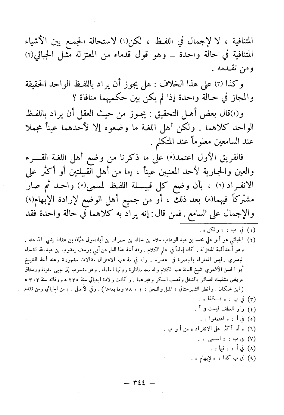 (¬2) الجبائي هو أبو علي محمد بن عبد الوهاب سلام بن خالد بن حمران برن أبان مولى عثمان في عفان رضي الله عنه. وهو أحد أئمة المعتزلة. كان إماماً في علم الكلام. وقد أخذ هذا العلم عن أبي يوسف يعقوب بن عبد الله الشحام البصري رئيس المعتزلة بالبصرة في عصره. وله في مذهب الاعتزال مقالات مشهورة وعنه أخذ الشيخ أبر الحسن الأشعري شيخ السنة علم الكلام وله معه مناظرة روتها العلماء. وهو منسوب إلى جبى مدينة ورستاق عريض مشتبك العمائر بالنخل وقصب السكر وغيرهما. وكانت ولادة الجبائي سنة 235 هـ ووفاته سنة 303 هـ (ابن خلكان. وانظر الشهرستاني، الملل والخل، 1: 78 وما بعدها). وفي الأصل: "من الجبائى ومن تقدم
