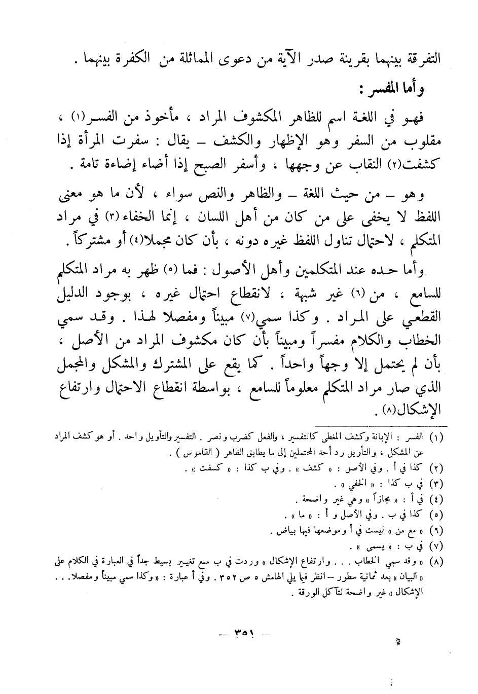 (¬8) "وقد سمي الخطاب ... وارتفاع الإشكال" وردت في ب سع تغيير بسيط جداً في العبارة في الكلام على "البيان" بعد ثمانية سطور - انظر فيما يلى الهامش 5 ص 352. وفي أعبارة: " وكذا سمي مبيناً ومفصلا ... الإشكال" غير واضحة لتآكل الورقة.