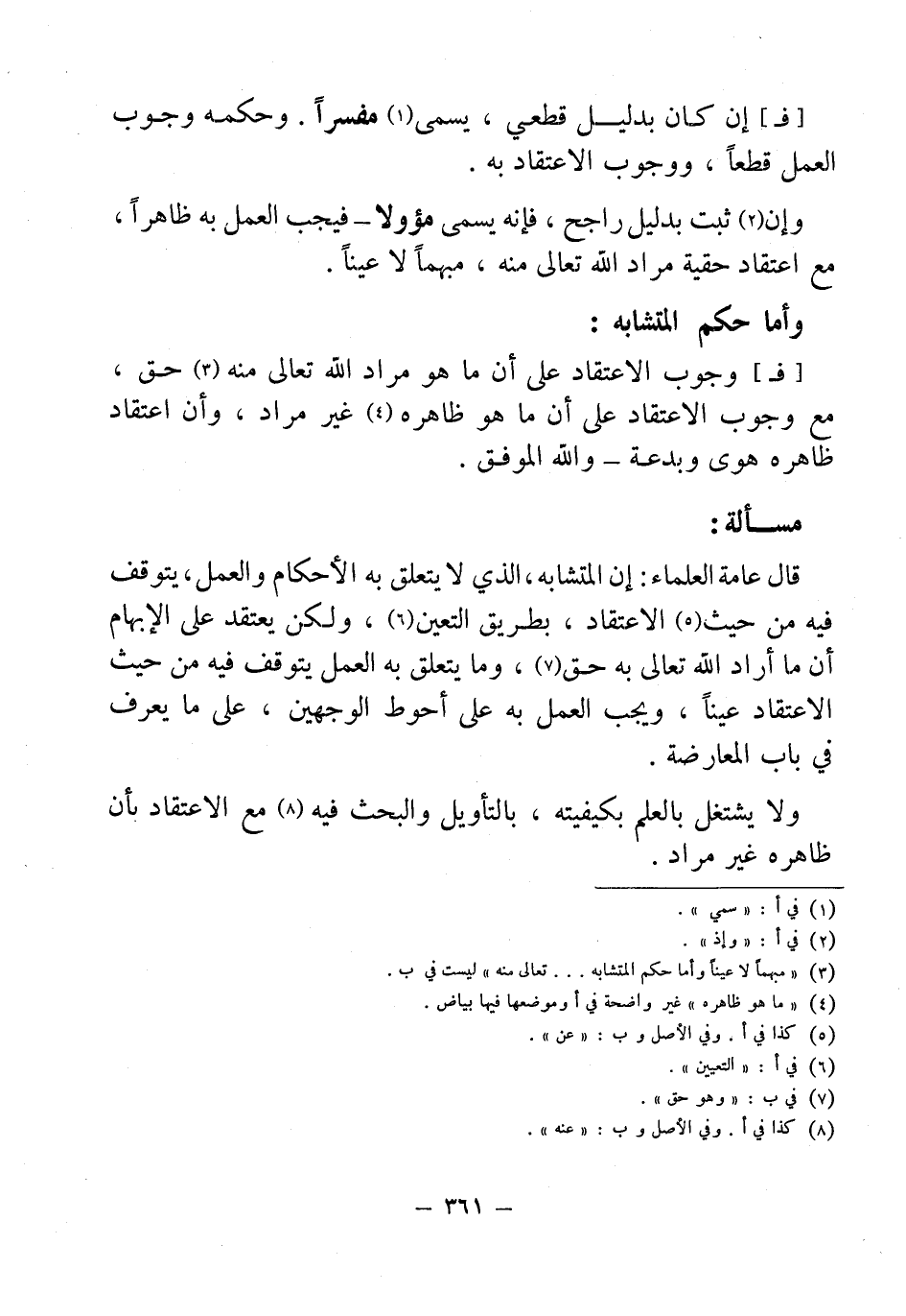 قال عامة العلماء: إن التشابه، الذي لا يتعلق به الأحكام والعمل، يتوقف فيه من حيث (¬5) الاعتقاد، بطروق التعين (¬6)، ولكن يعتقد على الإبهام أن ما أراد الله، تعالى به حق (¬7)، وما يتعلق به العمل يتوقف فيه من حيث الاعتقاد عيناً، ويجب العمل به على أحوط الوجهين، على ما يعرف في باب المعارضة.