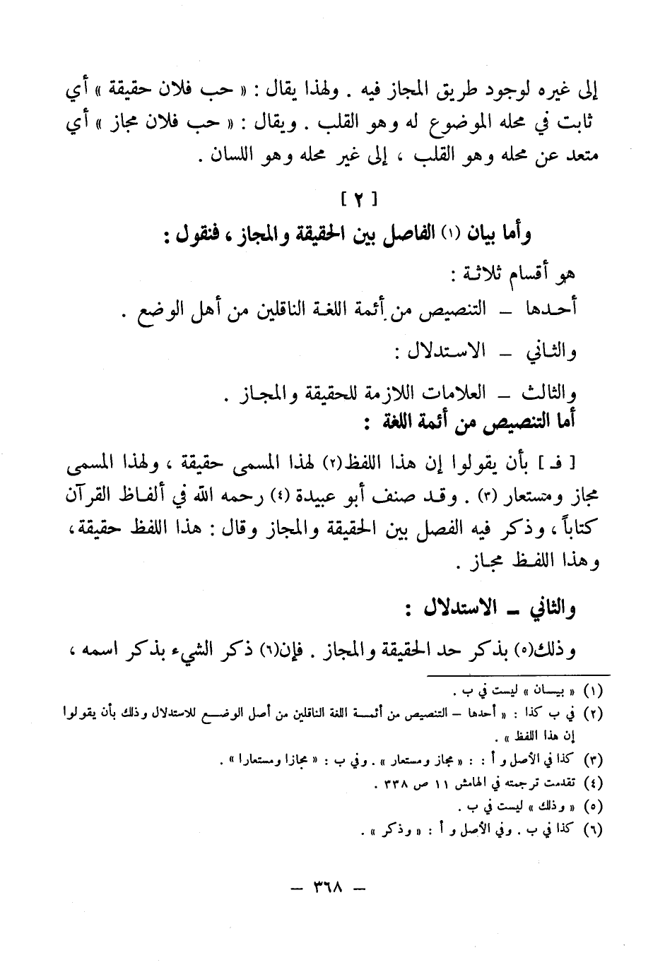 [فـ] بأن يقولوا إن هذا اللفظ (¬2) لهذا المسمى حقيقة، ولهذا المسمى مجاز ومستعار (¬3). وقد صنف أبو عبيدة (¬4) رحمه الله في ألفاظ القرآن كتاباً، وذكر فيه الفصل بين الحقيقة والمجاز وقال: هذا اللفظ حقيقة، وهذا اللفظ مجاز.