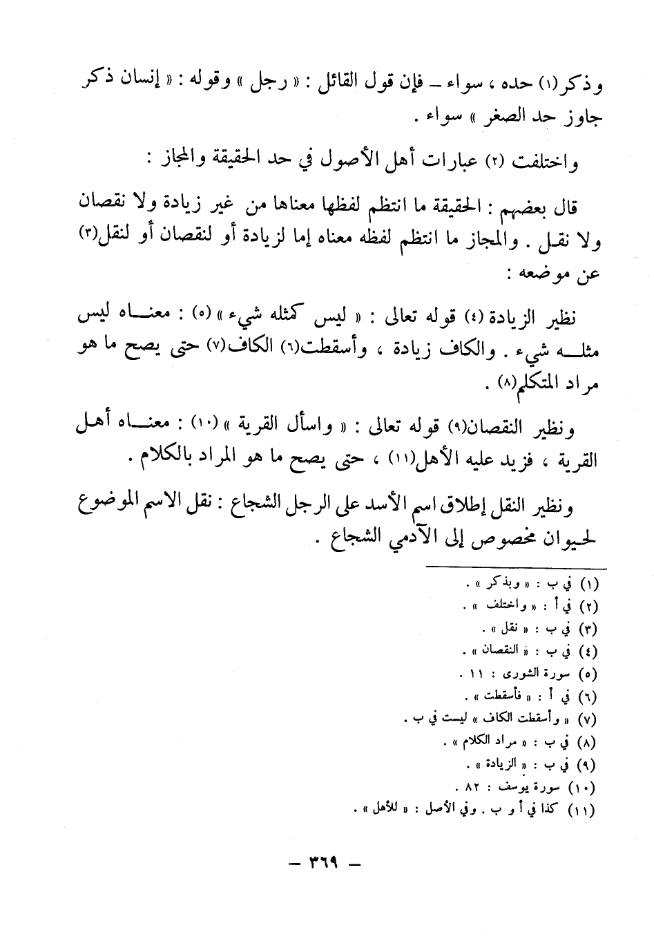ونظير النقصان (¬9) قوله تعالى: "واسأل القرية" (¬10): معناه أهل القرية، فزيد عليه الأهل (¬11)، حتى يصح ما هو المراد بالكلام.