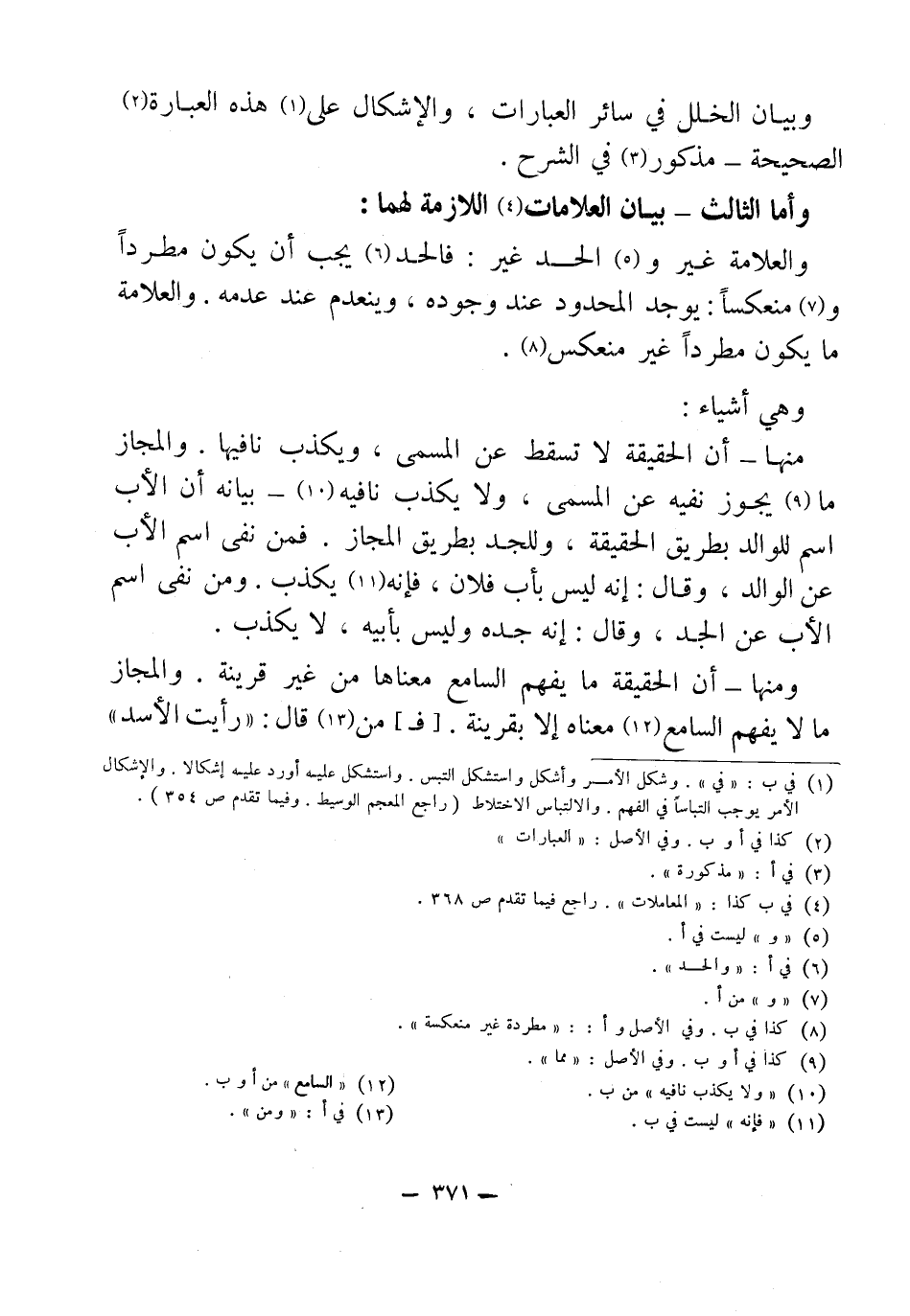 وبيان الخلل في سائر العبارات, والإشكال على (¬1) هذه العبارة (¬2) الصحيحة - مذكور (¬3) في الشرح.