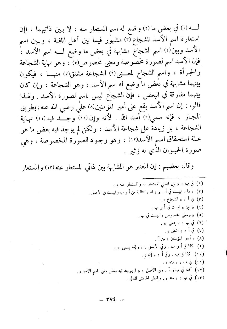 له (¬1) في بعض ما (¬2) وضع له اسم المستعار منه، لا بين ذاتيهما، فإن استعارة اسم الأسد للشجاع (¬3) مشهور فيما بين أهل اللغة، وبين اسم الأسد وبين (¬4) اسم الشجاع مشابهة في بعض ما وضع له اسم الأسد، فإن الأسد اسم لصورة مخصوصة ومعنى مخصوص (¬5)، وهو نهاية الشجاعة والجرأة، واسم الشجاع لمعنى (¬6) الشجاعة مشتق (¬7) منها، في فيكون بينهما مشابهة في بعض ما وضع له اسم الأسد، وهو الشجاعة، وإن كان بينهما مفارقة في البعض، فإن الشجاع ليس باسم لصورة الأسد. ولهذا قالوا: إن اسم الأسد يقع على أمير المؤمنين (¬8) علي رضي الله عنه، بطريق المجاز، فإنه سمي (¬9) أسد الله. لأنه وإن (¬10) وجد فيه (¬11) نهاية الشجاعة، بل زيادة على شجاعة الأسد، ولكن لم يوجد فيه بعض ما هو علة استحقاق اسم الأسد (¬12)، وهو وجود الصورة المخصوصة، وهي صورة الحيوان الذي له زئير.