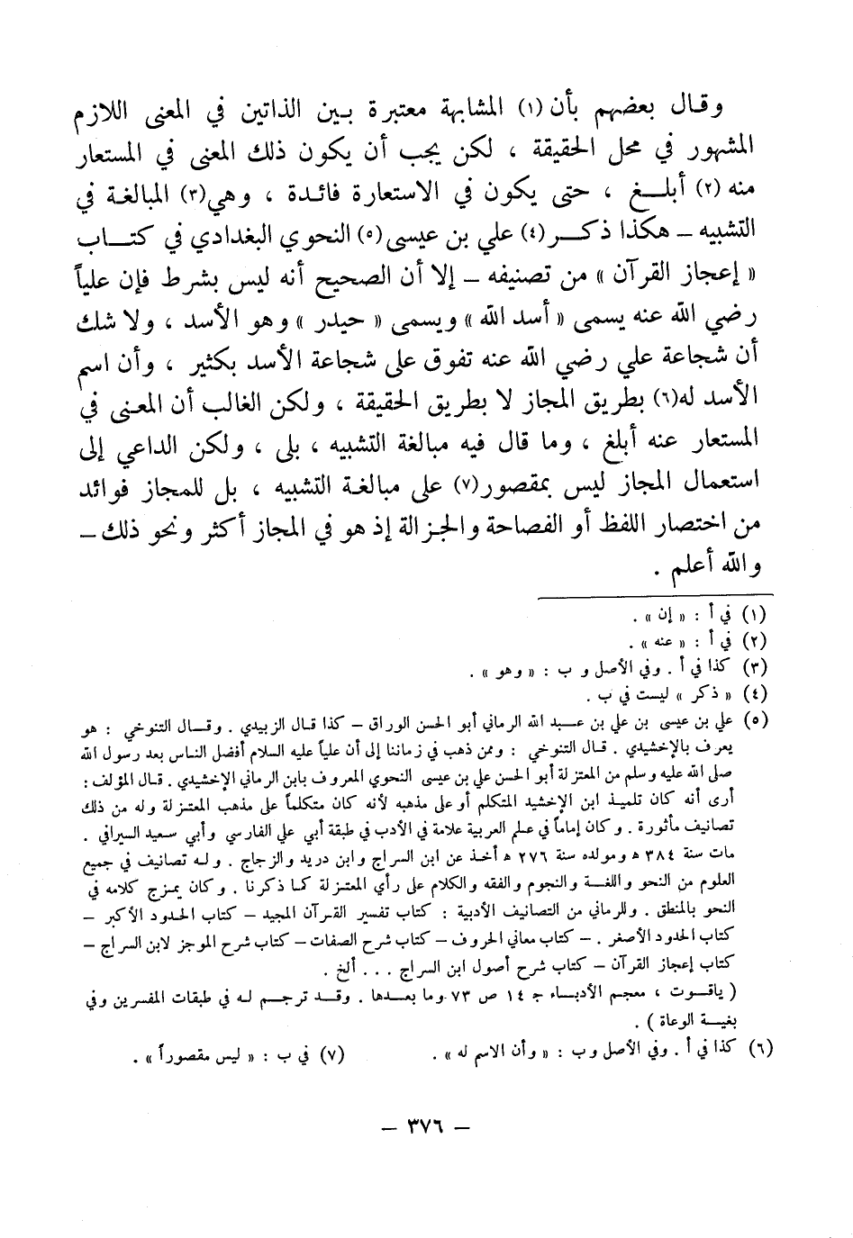 (¬5) علي بن عيسى بن علي بن عبد الله الرماني أبو الحسن الوراق - كذا قال الزبيدي. وقال التنوخي: هو يعرف بالإخشيدي. قال التنوخي: وممن ذهب في زماننا إلى أن علياً عليه السلام أفضل الناس بعد رسول الله صلى الله عليه وسلم من المعتزلة أبو الحسن علي بن عيسى النحوي المعروف بابن الرماني الإخشدي. وقال المؤلف: أرى أنه كان تلميذ ابن الإخشد المتكلم أو على مذهبه لأنه كان متكلماً على مذهب المعتزلة وله من ذلك تصانيف مأثورة. وكان إماماً في علم العربية علامة في الأدب في طبقة أبي علي الفارسي وأبي سعيد السيرافي. مات سنة 384 هـ ومولده سنة 276 هـ أخذ عن ابن السراج وابن دريد والزجاج. وله تصانيف في جميع العلوم من النحو واللغة والنجوم والفقه والكلام على رأي المعتزلة كما ذكرنا. وكان يمزج كلامه في النحو بالمنطق. وللرماني من التصانيف الأدبية: كتاب تفسير القرآن المجيد - كتاب الحدود الأكبر - كتاب الحدود الأصغر. - كتاب معاني الحروف - كتاب شرح الصفات - كتاب شرح الموجز لابن السراج - كتاب إعجاز القرآن - كتاب شرح أصول ابن السراج ... ألخ.