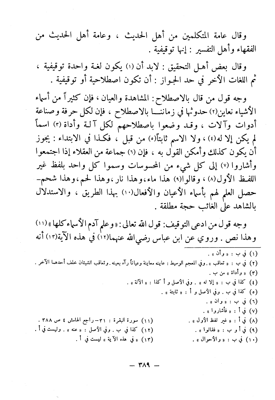 وجه قول من ادعى التوقيف: قول الله تعالى: "وعلم آدم الأسماء كلها" (¬11) وهذا نص. وروي عن ابن عباس رضي الله عنهما (¬12) في هذه الآية (¬13) أنه