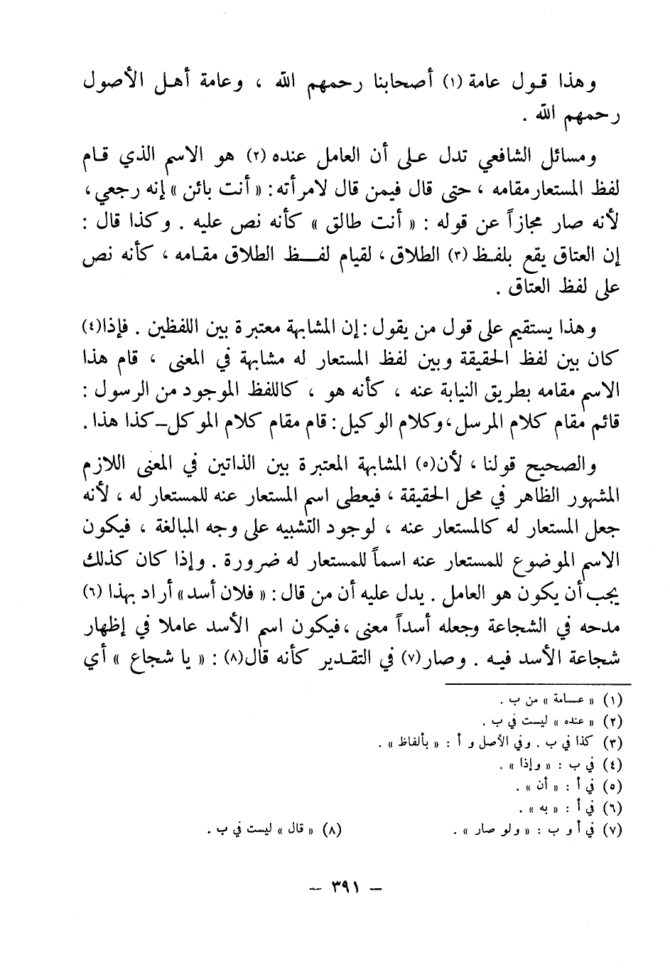 ومسائل الشافعي تدل على أن العامل عنده (¬2) هو الاسم الذي قام لفظ المستعار مقامه، حتى قال فيمن قال لامرأته: "أنت بائن" إنه رجعي، لأنه صار مجازاً عن قوله: "أنت طالق" كأنه نص عليه. وكذا قال: إن العتاق يقع بلفظ (¬3) الطلاق، لقيام لفظ الطلاق مقامه، كأنه نص على لفظ العتاق.
