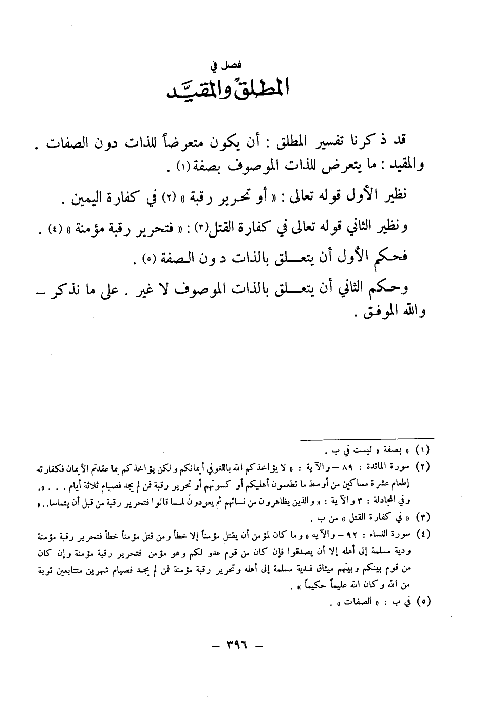 قد ذ كرنا تفسير المطلق: أن يكون متعرضاً للذات دون الصفات. والمقيد: ما يتعرض للذات الموصوف بصفة (¬1).