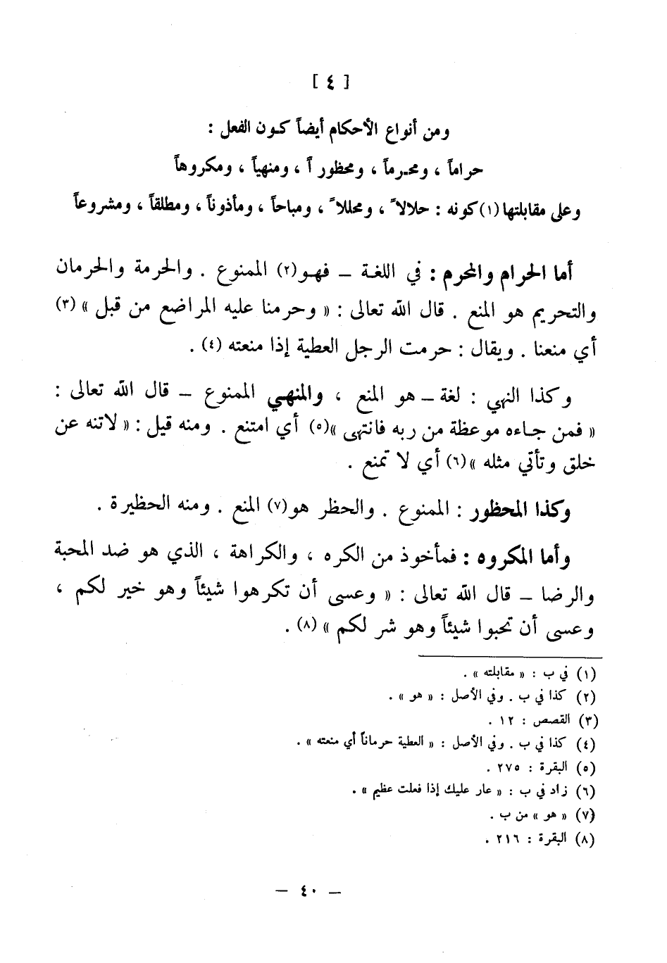 ومن أنواع الأحكام أيضاً كون الفعل: حراماً، ومحرماً، ومحظوراً، ومنهياً، ومكروهاً وعلى مقابلتها (¬1) كونه: حلالًا، ومحللاً، ومباحاً، ومأذوناً، ومطلقاً، ومشروعاً