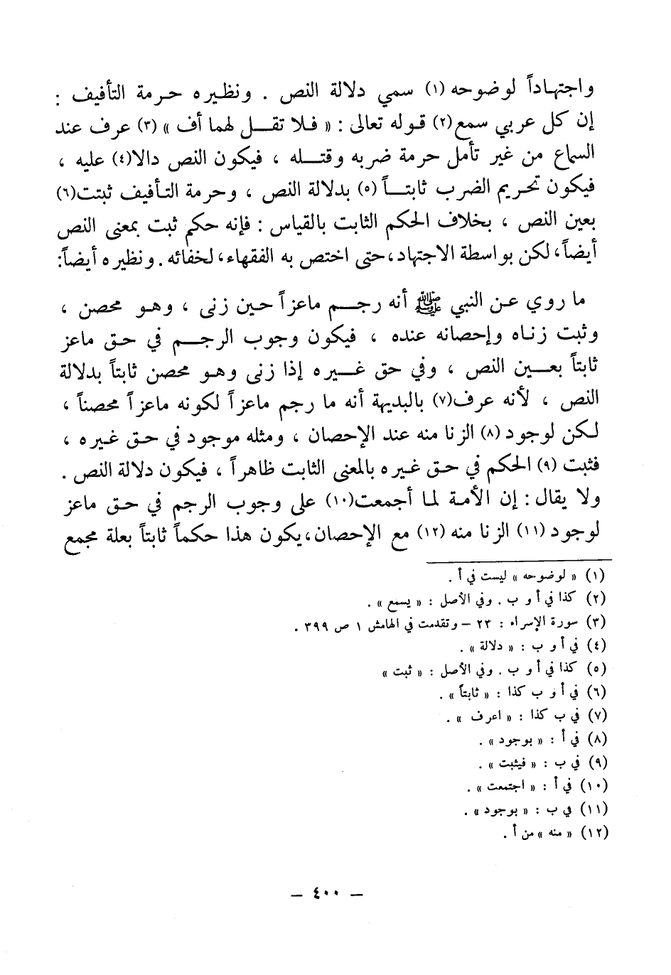واجتهاداً لوضوحه (¬1) سمي دلالة النص. ونظيره حرمة التأفيف: إن كل عربي سمع (¬2) قوله تعالى: "فلا تقل لهما أف" (¬3) عرف عند السماع من غير تأمل حرمة ضربه وقتله، فيكون النص دالا (¬4) عليه، فيكون تحريم الضرب ثابتاً (¬5) بدلالة النص، وحرمة التأفيف ثبتت (¬6) بعين النص، بخلاف الحكم الثابت بالقياس: فإنه حكم ثبت بمعنى النص أيضاً، لكن بواسطة الاجتهاد، حتى اختص به الفقهاء، لخفائه. ونظيره أيضاً: