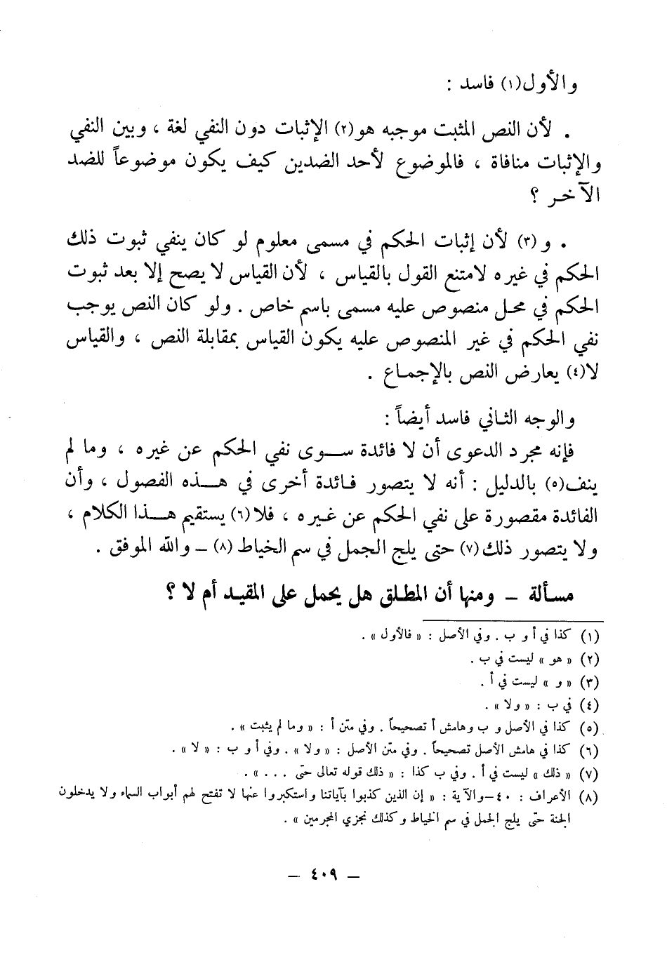 فإنه مجرد الدعوى أن لا فائدة سوى نفي الحكم عن غيره، وما لم ينف (¬5) بالدليل: أنه لا يتصور فائدة أخرى في هذه الفصول، وأن الفائدة مقصورة على نفي الحكم عن غيره، فلا (¬6) يستقيم هذا الكلام، ولا يتصور ذلك (¬7) حتى يلج الجمل في سم الخياط (¬8) - والله الموفق.