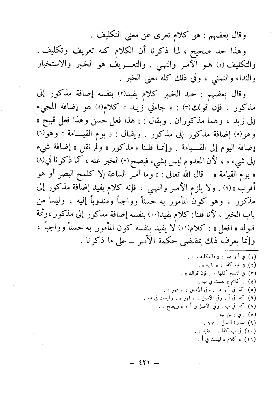 وهذا حد صحيح، لما ذكرنا أن الكلام كله تعريف وتكليف والتكليف (¬1) هو الأمر والنهي. والتعريف هو الخبر والاستخبار والنداء والتمني، وفي ذلك كله معنى الخبر.