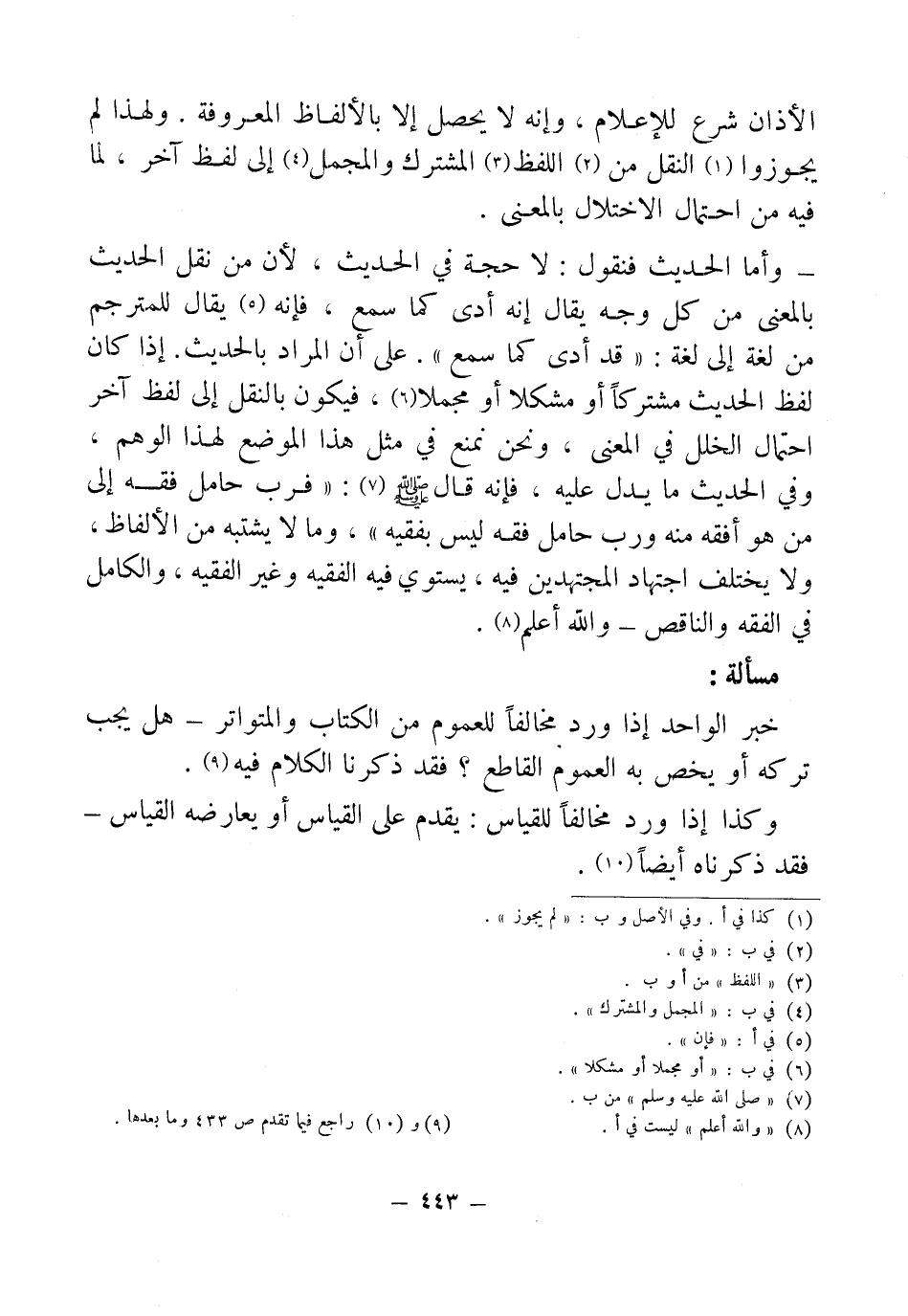 - وأما الحديث فنقول: لا حجة في الحديث، لأن من نقل الحديث بالمعنى من كل وجه يقال إنه أدى كما سمع، فإنه (¬5) يقال للمترجم من لغة إلى لغة: "قد أدى كما سمع". على أن المراد بالحديث. إذا كان لفظ الحديث مشتركًا أو مشكلا أو مجملا (¬6)، فيكون بالنقل إلى لفظ آخر احتمال الخلل في المعنى، ونحن نمنع في مثل هذا الموضع لهذا الوهم، وفي الحديث ما يدل عليه، فإنه قال - صلى الله عليه وسلم - (¬7): "فرب حامل فقه إلى من هو أفقه منه ورب حامل فقه ليس بفقيه"، وما لا يشتبه من الألفاظ، ولا يختلف اجتهاد المجتهدين فيه، يستوي فيه الفقيه وغير الفقيه، والكامل في الفقه والناقص - والله أعلم (¬8).