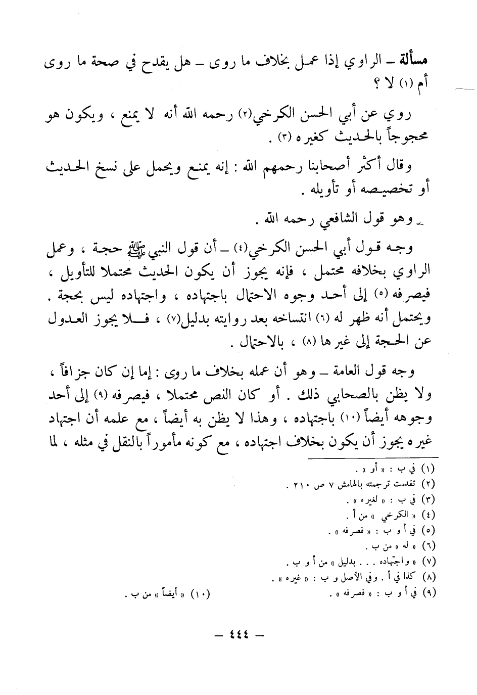 وجه قول أبي الحسن الكرخي (¬4) - أن قول النبي - صلى الله عليه وسلم - حجة، وعمل الراوي بخلافه محتمل، فإنه يجوز أن يكون الحديث محتملا للتأويل، فيصرفه (¬5) إلى أحد وجوه الاحتمال باجتهاده، واجتهاده ليس بحجة. ويحتمل أنه ظهر له (¬6) انتساخه بعد روايته بدليل (¬7)، فلا يجوز العدول عن الحجة إلى غيرها (¬8)، بالاحتمال.