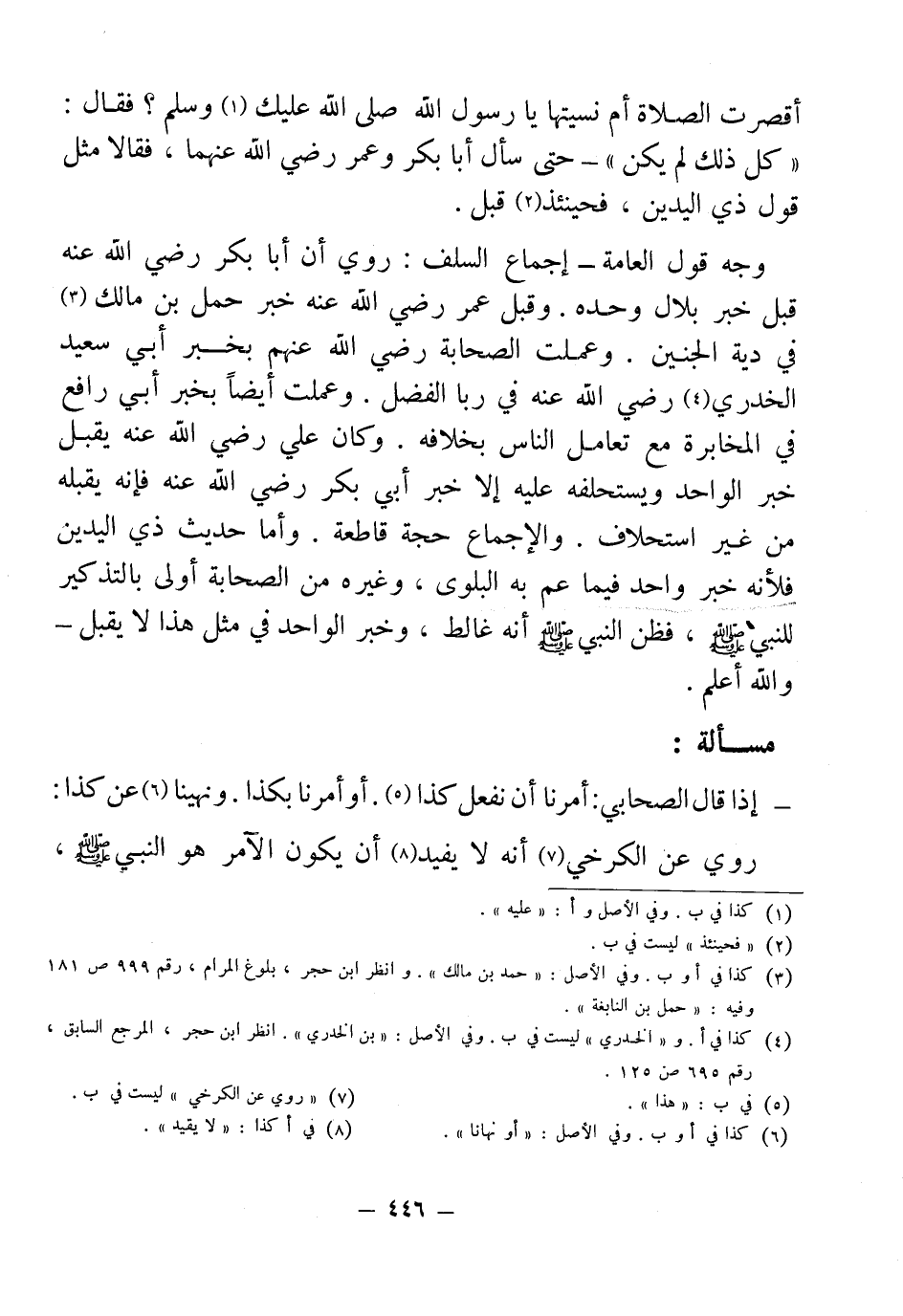 وجه قول العامة - إجماع السلف: روي أن أبا بكر رضي الله عنه قبل خبر بلال وحده. وقبل عمر رضي الله عنه خبر حمل بن مالك (¬3) في دية الجنين. وعملت الصحابة رضي الله عنهم بخبر أبي سعيد الخدري (¬4) رضي الله عنه في ربا الفضل. وعملت أيضًا بخبر أبي رافع في المخابرة مع تعامل فى الناس بخلافه. وكان علي رضي الله عنه يقبل خبر الواحد ويستحلفه عليه إلا خبر أبي بكر رضي الله عنه فإنه يقبله من غير استحلاف. والإجماع حجة قاطعة. وأما حديث ذي اليدين فلأنه خبر واحد فيما عم به البلوى، وغيره من الصحابة أولى بالتذكير للنبي - صلى الله عليه وسلم -، فظن النبي - صلى الله عليه وسلم - أنه غالط، وخبر الواحد في مثل هذا لا يقبل - والله أعلم.