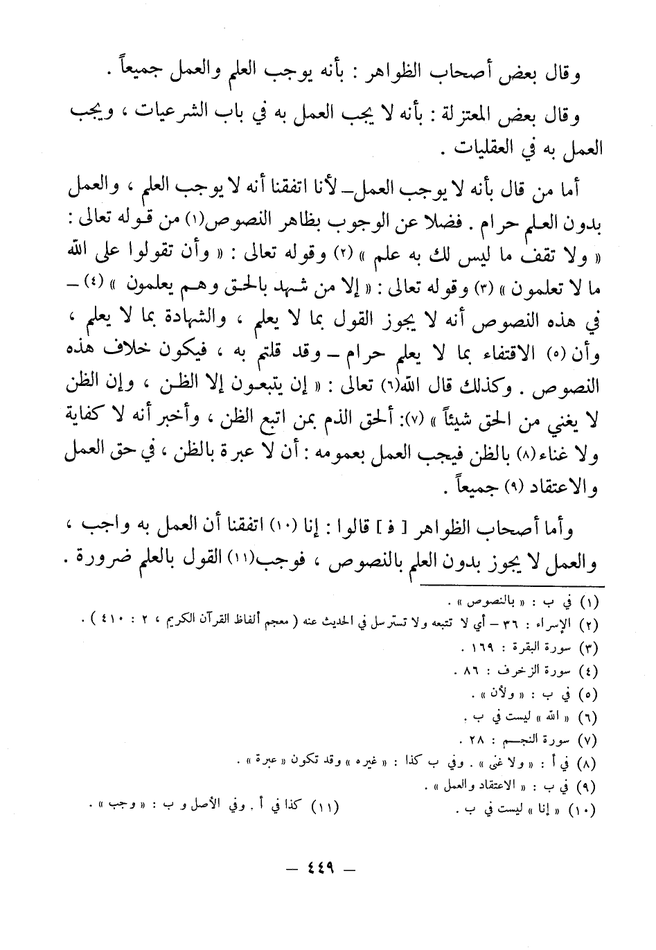 أما من قال بأنه لا يوجب العمل - لأنا اتفقنا أنه لا يوجب العلم، والعمل بدون العلم حرام. فضلا عن الوجوب بظاهر النصوص (¬1) من قوله تعالى: "ولا تقف ما ليس لك به علم" (¬2) وقوله تعالى: "وأن تقولوا على الله ما لا تعلمون" (¬3) وقوله تعالى: "إلا من شهد بالحق وهم يعلمون" (¬4) - في هذه النصوص أنه لا يجوز القول بما لا يعلم، والشهادة بما لا يعلم، وأن (¬5) الاقتفاء بما لا يعلم حرام - وقد قلتم به، فيكون خلاف هذه النصوص. وكذلك قال الله (¬6) تعالى: "إن يتبعون إلا الظن، وإن الظن لا يغني من الحق شيئًا" (¬7): ألحق الذم بمن اتبع الظن، وأخبر أنه لا كفاية ولا غناء (¬8) بالظن فيجب العمل بعمومه: أن لا عبرة بالظن، في حق العمل والاعتقاد (¬9) جميعًا.