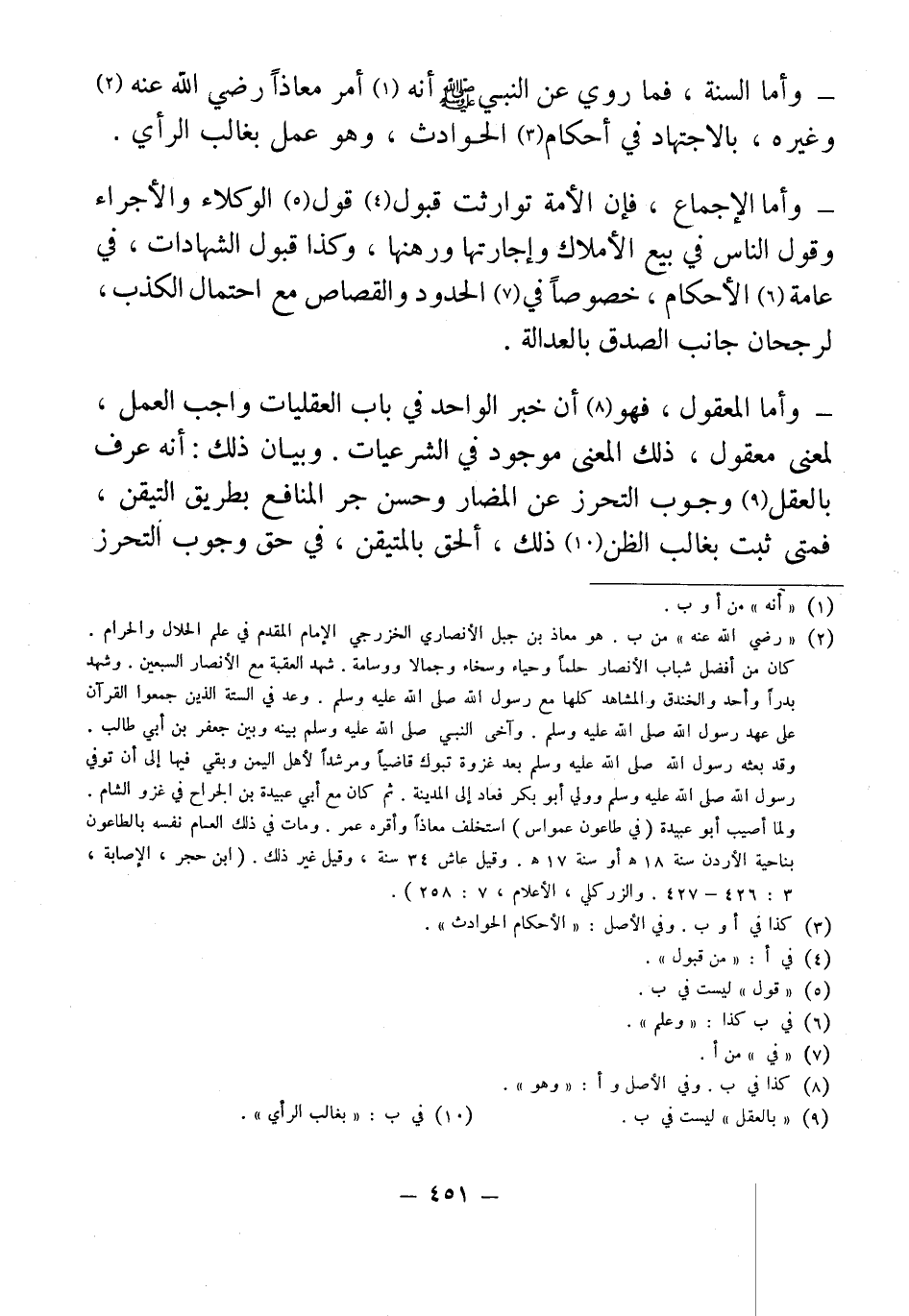 - وأما المعقول، فهو (¬8) أن خبر الواحد في باب العقليات واجب العمل، لمعنى معقول، ذلك المعنى موجود في الشرعيات. وبيان ذلك: أنه عرف بالعقل (¬9) وجوب التحرز عن المضار وحسن جر المنافع بطريق التيقن، فمتى ثبت بغالب الظن (¬10) ذلك، ألحق بالمتيقن، في حق وجوب التحرز