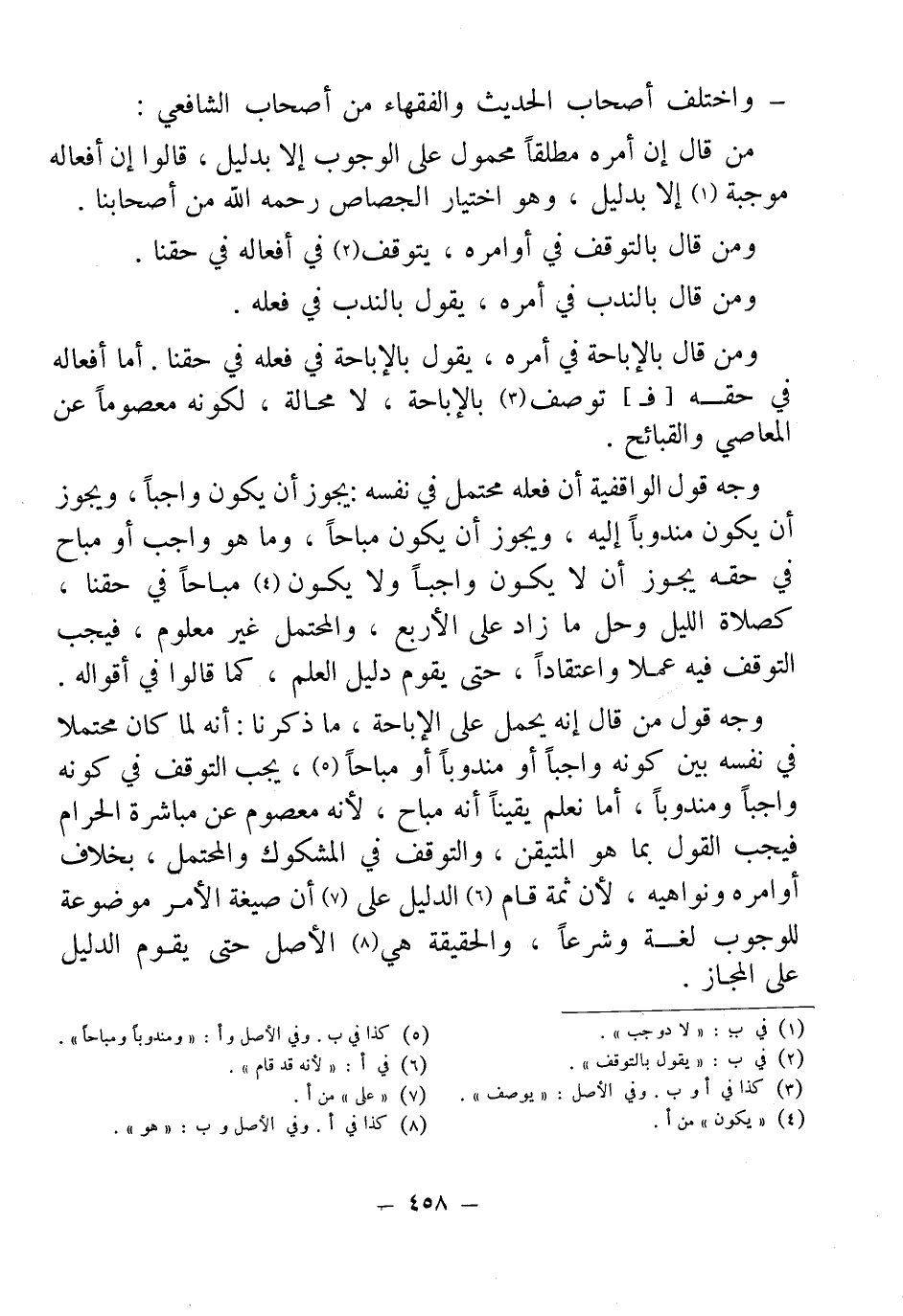 وجه قول الواقفية أن فعله محتمل في نفسه: يجوز أن يكون واجبًا، ويجوز أن يكون مندوبًا إليه، ويجوز أن يكون مباحًا، وما هو واجب أو مباح في حقه يجوز أن لا يكون واجبًا ولا يكون (¬4) مباحًا في حقنا، كصلاة الليل وحل ما زاد على الأربع، والمحتمل غير معلوم، فيجب التوقف فيه عملا واعتقادًا، حتى يقوم دليل العلم، كما قالوا في أقواله.