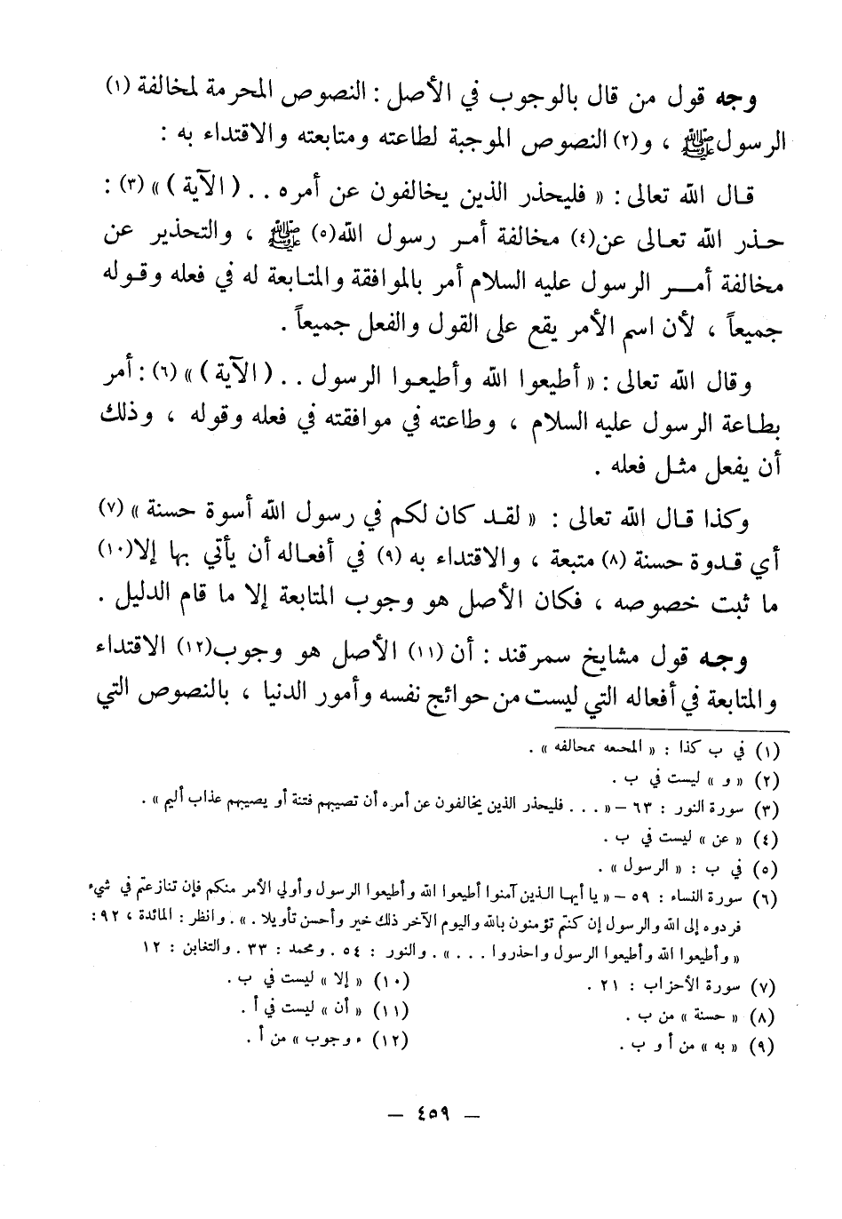 (¬6) سورة النساء: 59 - "يا أيها الذين آمنوا أطيعوا الله وأطيعوا الرسول وأولي الأمر منكم فإن تنازعتم في شيء فردوه إلى الله والرسول إن كنتم تؤمنون بالله واليوم الآخر ذلك خير وأحسن تأويلا.". وانظر: المائدة، 92: "وأطيعوا الله وأطيعوا الرسول واحذروا ... ". والنور: 54. ومحمد: 33. والتغابن: 12