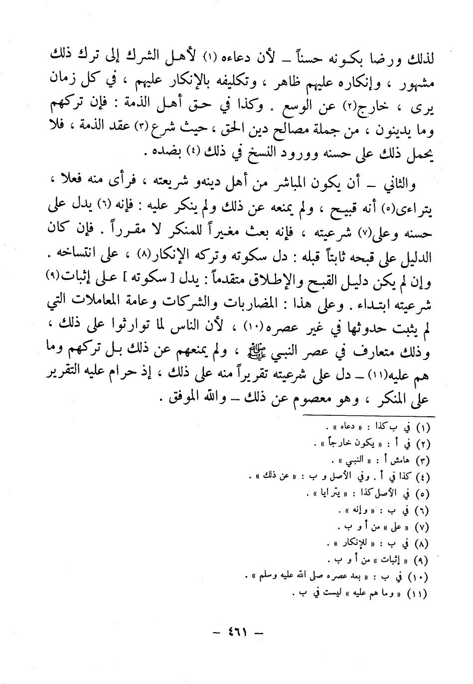 لذلك ورضا بكونه حسنًا - لأن دعاءه (¬1) لأهل الشرك إلى ترك ذلك مشهور، وإنكاره عليهم ظاهر، وتكليفه بالإنكار عليهم، في كل زمان يرى، خارج (¬2) عن الوسع. وكذا في حق أهل الذمة: فإن تركهم وما يدينون، من جملة مصالح دين الحق، حيث شرع (¬3) عقد الذمة، فلا يحمل ذلك على حسنه وورود النسخ في ذلك (¬4) بضده.