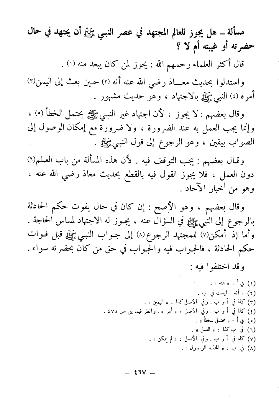 وقال بعضهم، وهو الأصح: إن كان في حال يفوت حكم الحادثة بالرجوع إلى النبي - صلى الله عليه وسلم - في السؤال عنه، يجوز له الاجتهاد لمساس الحاجة. وأما إذ أمكن (¬7) للمجتهد الرجوع (¬8) إلى جواب النبي - صلى الله عليه وسلم - قبل فوات حكم الحادثة، فالجواب فيه والجواب في حق من كان بحضرته سواء.