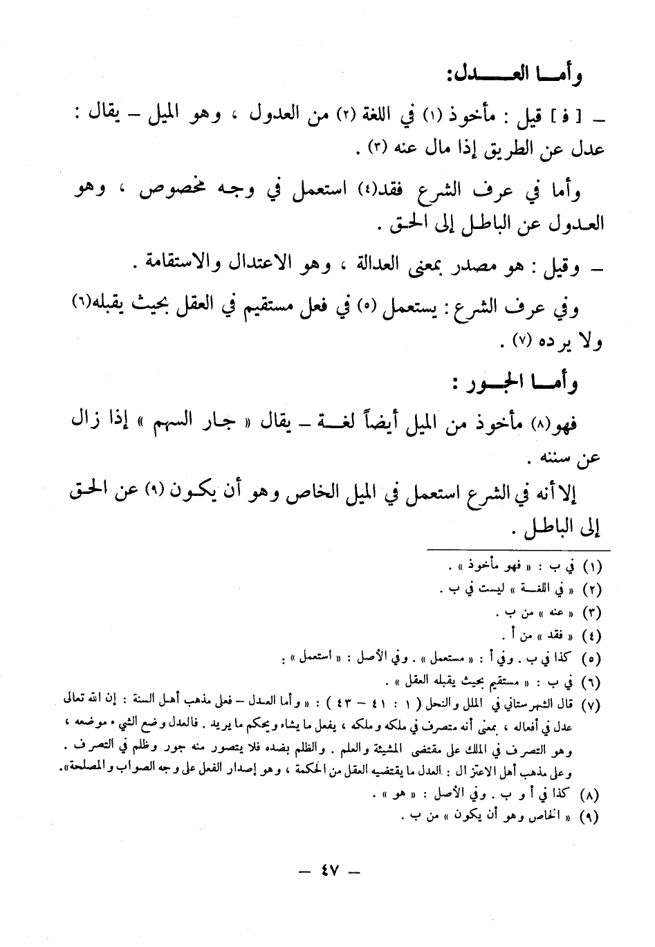 (¬7) قال الشهرستاني في الملل والنحل (1: 41 - 43): "وأما العدل - فعلى مذهب أهل السنة: إن الله تعالى عدل في أفعاله، بمعنى أنه متصرف في ملكه وملكه، يفعل ما يشاء ويحكم ما يريد. فالعدل وضع الشيء موضعه، وهو التصرف في الملك على مقتضى المشيئة والعلم. والظلم بضده فلا يتصور منه جور وظلم في التصرف. وعلى مذهب أهل الاعتزال: العدل ما يقتضيه العقل من الحكمة، وهو إصدار الفعل على وجه الصواب والمصلحة".