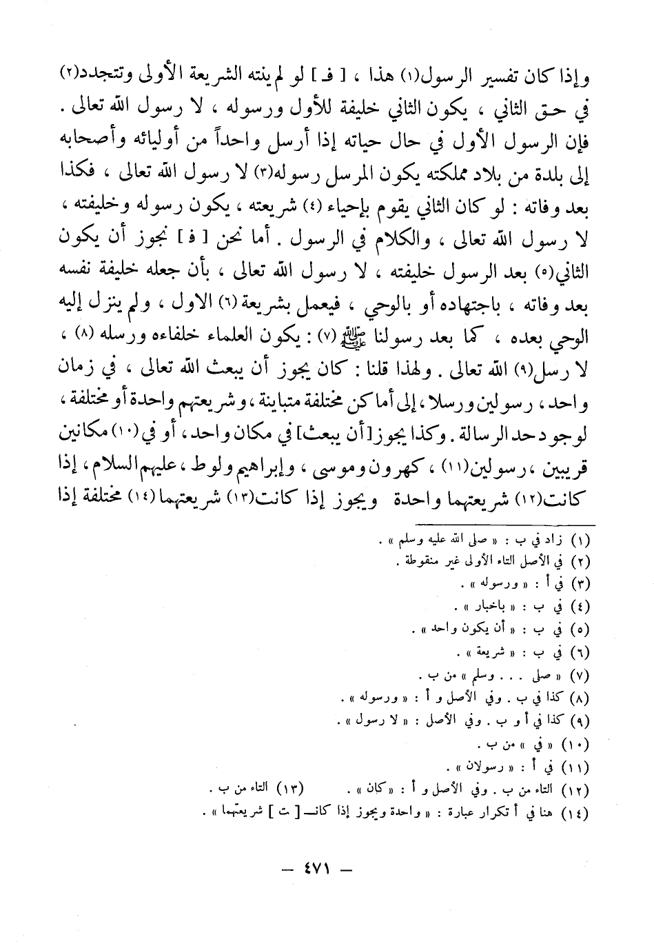 وإذا كان تفسير الرسول (¬1) هذا، [فـ] لو لم ينته الشريعة الأولى وتتجدد (¬2) في حق الثاني، يكون الثاني خليفة للأول ورسوله، لا رسول الله تعالى. فإن الرسول الأول في حال حياته إذا أرسل واحدًا من أوليائه وأصحابه إلى بلدة من بلاد مملكته يكون المرسل رسوله (¬3) لا رسول الله تعالى، فكذا بعد وفاته: لو كان الثاني يقوم بإحياء (¬4) شريعته، يكون رسوله وخليفته، لا رسول الله تعالى، والكلام في الرسول. أما نحن [فـ] نجوز أن يكون الثاني (¬5) بعد الرسول خليفته، لا رسول الله تعالى، بأن جعله خليفة نفسه بعد وفاته، باجتهاده أو بالوحي، فيعمل بشريعة (¬6) الأول، ولم ينزل إليه الوحي بعده، كما بعد رسولنا - صلى الله عليه وسلم - (¬7): يكون العلماء خلفاءه ورسله (¬8)، لا رسل (¬9) الله تعالى. ولهذا قلنا: كان يجوز أن يبعث الله تعالى، في زمان واحد، رسولين ورسلا، إلى أماكن مختلفة متباينة، وشريعتهم واحدة أو مختلفة، لوجود حد الرسالة. وكذا يجوز [أن يبعث] في مكان واحد، أو في (¬10) مكانين قريبين، رسولين (¬11)، كهرون وموسى، وإبراهيم ولوط، عليهم السلام، إذا كانت (¬12) شريعتهما واحدة ويجوز إذا كانت (¬13) شريعتهما (¬14) مختلفة إذا