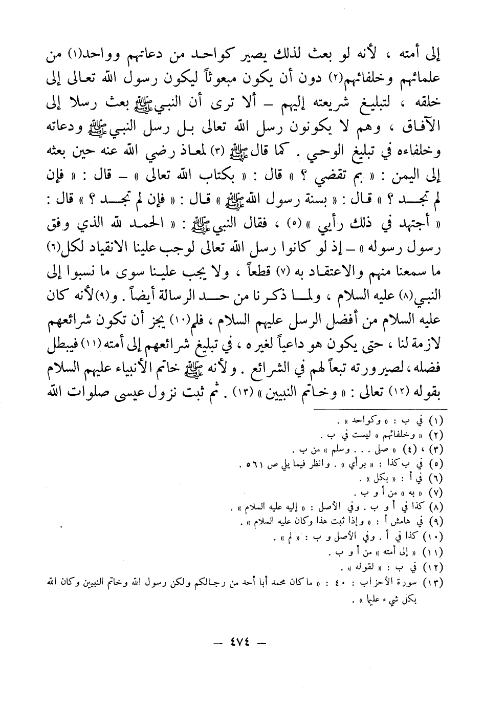 إلى أمته، لأنه لو بعث لذلك يصير كواحد من دعاتهم وواحد (¬1) من علمائهم وخلفائهم (¬2) دون أن يكون مبعوثاً ليكون رسول الله تعالى إلى خلقه، لتبليغ شريعته إليهم - ألا ترى أن النبي - صلى الله عليه وسلم - بعث رسلا إلى الآفاق، وهم لا يكونون رسل الله تعالى بل رسل النبي - صلى الله عليه وسلم - ودعاته وخلفاءه في تبليغ الوحي. كما قال - صلى الله عليه وسلم - (¬3) لمعاذ رضي الله عنه حين بعثه إلى اليمن: "بم تقضي؟ " قال: "بكتاب الله تعالى" - قال: "فإن لم تجد؟ " قال: "بسنة رسول الله - صلى الله عليه وسلم - " (¬4) قال: "فإن لم تجد؟ " قال: "أجتهد في ذلك رأيي" (¬5)، فقال النبي - صلى الله عليه وسلم -: "الحمد لله الذي وفق رسول رسوله" - إذ لو كانوا رسل الله تعالى لوجب علينا الانقياد لكل (¬6) ما سمعنا منهم والاعتقاد به (¬7) قطعًا، ولا يجب علينا سوى ما نسبوا إلى النبي (¬8) عليه السلام، ولما ذكرنا من حد الرسالة أيضاً. و (¬9) لأنه كان عليه السلام من أفضل الرسل عليهم السلام، فلم (¬10) يجز أن تكون شرائعهم لازمة لنا، حتى يكون هو داعياً لغيره، في تبليغ شرائعهم إلى أمته (¬11) فيبطل فضله، لصيرورته تبعاً لهم في الشرائع. ولأنه - صلى الله عليه وسلم - خاتم الأنبياء عليهم السلام بقوله (¬12) تعالى: "وخاتم النبيين" (¬13). ثم ثبت نزول عيسى صلوات الله