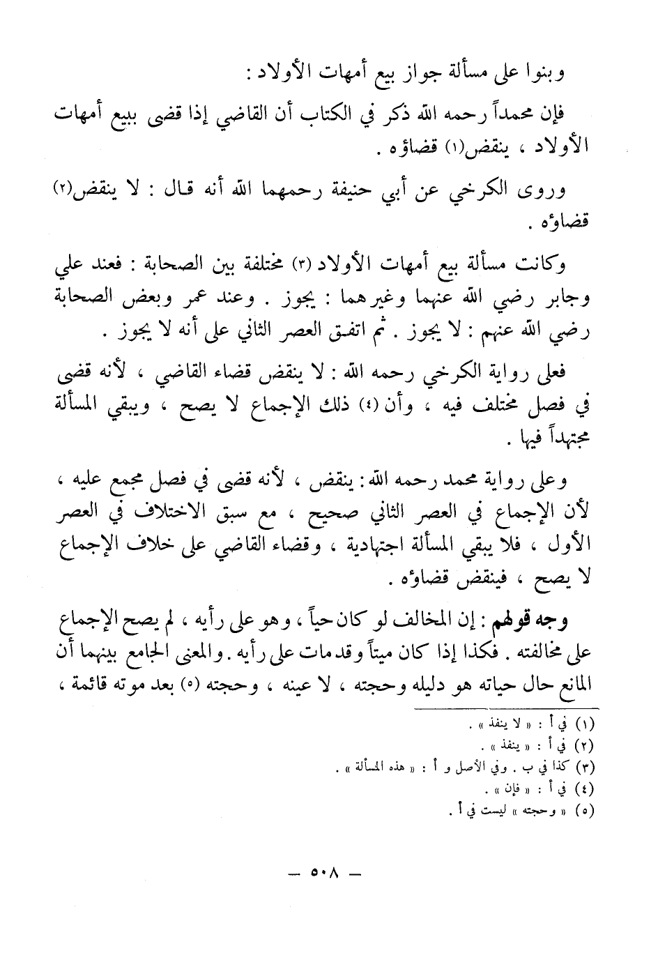 فإن محمداً رحمه الله ذكر في الكتاب أن القاضي إذا قضى ببيع أمهات الأولاد، ينقض (¬1) قضاؤه.