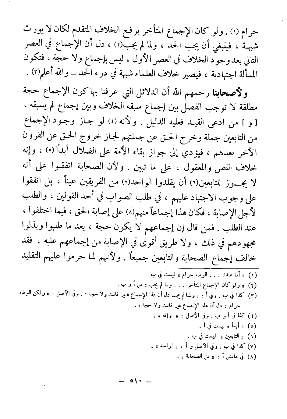 ولأصحابنا رحمهم الله أن الدلائل التي عرفنا بها كون الإجماع حجة مطلقة لا توجب الفصل بين إجماع سبقه الخلاف وبين إجماع لم يسبقه، [و] من ادعى القيد فعليه الدليل. ولأنه (¬4) لو جاز وجود الإجماع من التابعين جملة وخرج الحق عن جملتهم لجاز خروج الحق عن القرون الأخر بعدهم، فيؤدي إلى جواز بقاء الأمة على الضلال أبدًا (¬5)، وإنه خلاف النص والمعقول، على ما تبين. ولأن الصحابة اتفقوا على أنه لا يجوز للتابعين (¬6) أن يقدموا الواحد (¬7) من الفريقين عيناً، بل اتفقوا على وجوب الاجتهاد عليهم، في طلب الصواب في أحد القولين، والطلب لأجل الإصابة، فكان هذا إجماعاً منهم (¬8) على إصابة الحق، فيما اختلفوا، عند الطلب. فمن قال إن إجماعهم لا يكون حجة، بعد ما طلبوا وبذلوا مجهودهم في ذلك، ولا طريق أقوى في الإصابة من إجماعهم عليه، فقد خالف إجماع الصحابة والتابعين جميعاً. ولأنهم لما حرموا عليهم التقليد
