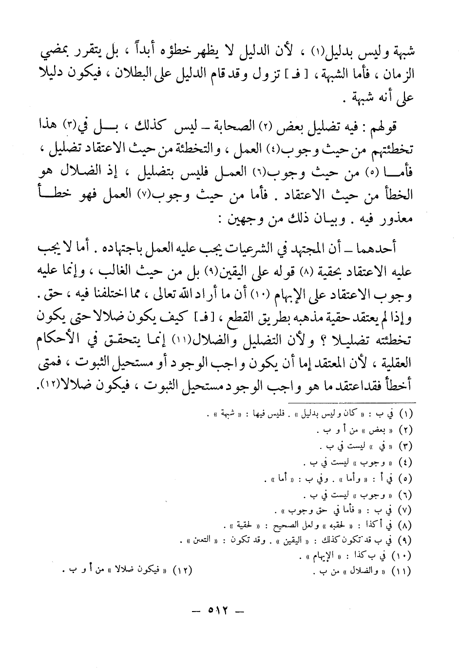 قولهم: فية تضليل بعض (¬2) الصحابة - ليس كذلك، بل في (¬3) هذا تخطئتهم من حيث وجوب (¬4) العمل، والتخطئة من حيث الاعتقاد تضليل، فأما (¬5) من حيث وجوب (¬6) العمل فليس بتضليل، إذ الضلال هو الخطأ من حيث الاعتقاد. فأما من حيث وجوب (¬7) العمل فهو خطأ معذور فيه. وبيان ذلك من وجهين: