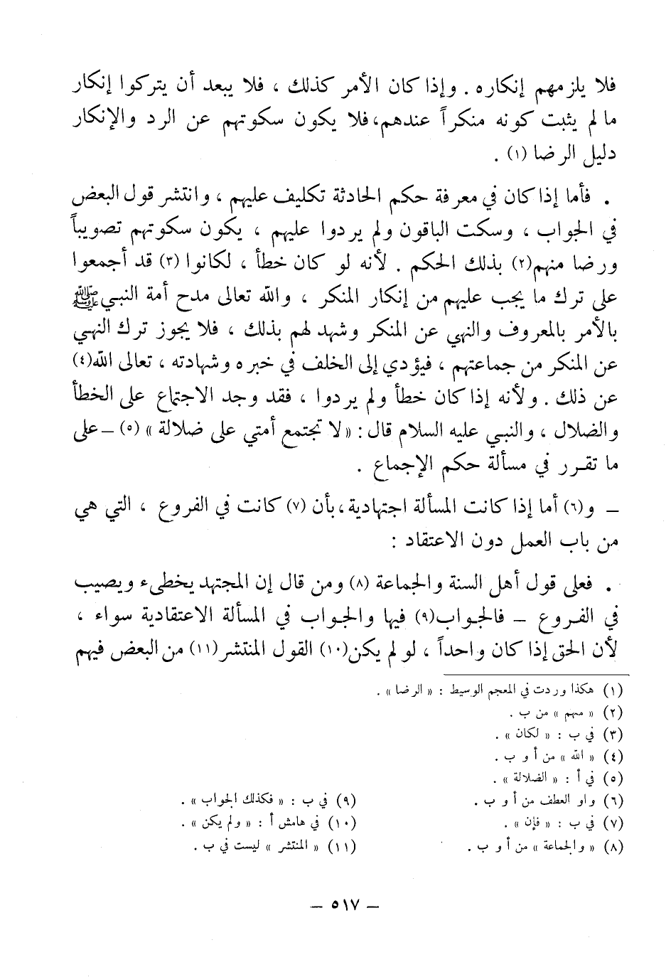 • فعلى قول أهل السنة والجماعة (¬8) ومن قال إن المجتهد يخطئ ويصيب في الفروع - فالجواب (¬9) فيها والجواب في المسألة الاعتقادية سواء، لأن الحق إذا كان واحدًا، لو لم يكن (¬10) القول المنتشر (¬11) من البعض فيهم