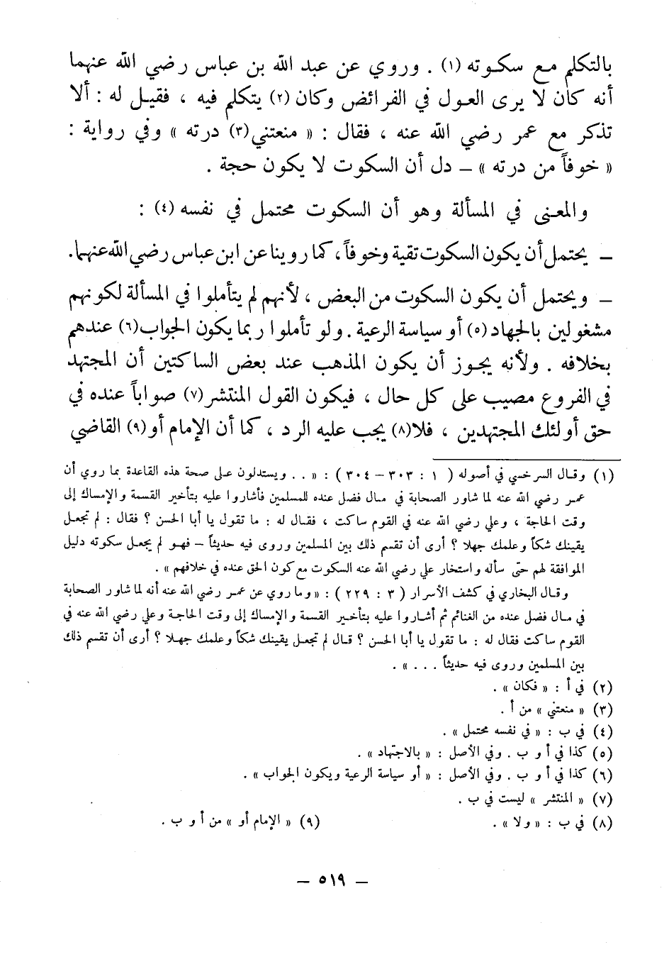(¬1) وقال السرخسي في أصوله (1: 303 - 304): " .. ويستدلون على صحة هذه القاعدة بما روي أن عمر رضي الله عنه لما شاور الصحابة في مال فضل عنده للمسلمين فأشاروا عليه بتأخير القسمة والإمساك إلى وقت الحاجة، وعلي رضي الله عنه في القوم ساكت، فقال له: ما تقول يا أبا الحسن؟ فقال: لم تجعل يقينك شكًا وعلمك جهلا؟ أرى أن تقسم ذلك بين المسلمين وروى فيه حديثًا - فهو لم يجعل سكوته دليل الموافقة لهم حتى سأله واستخار علي رضي الله عنه السكوت كون الحق عنده في خلافهم".