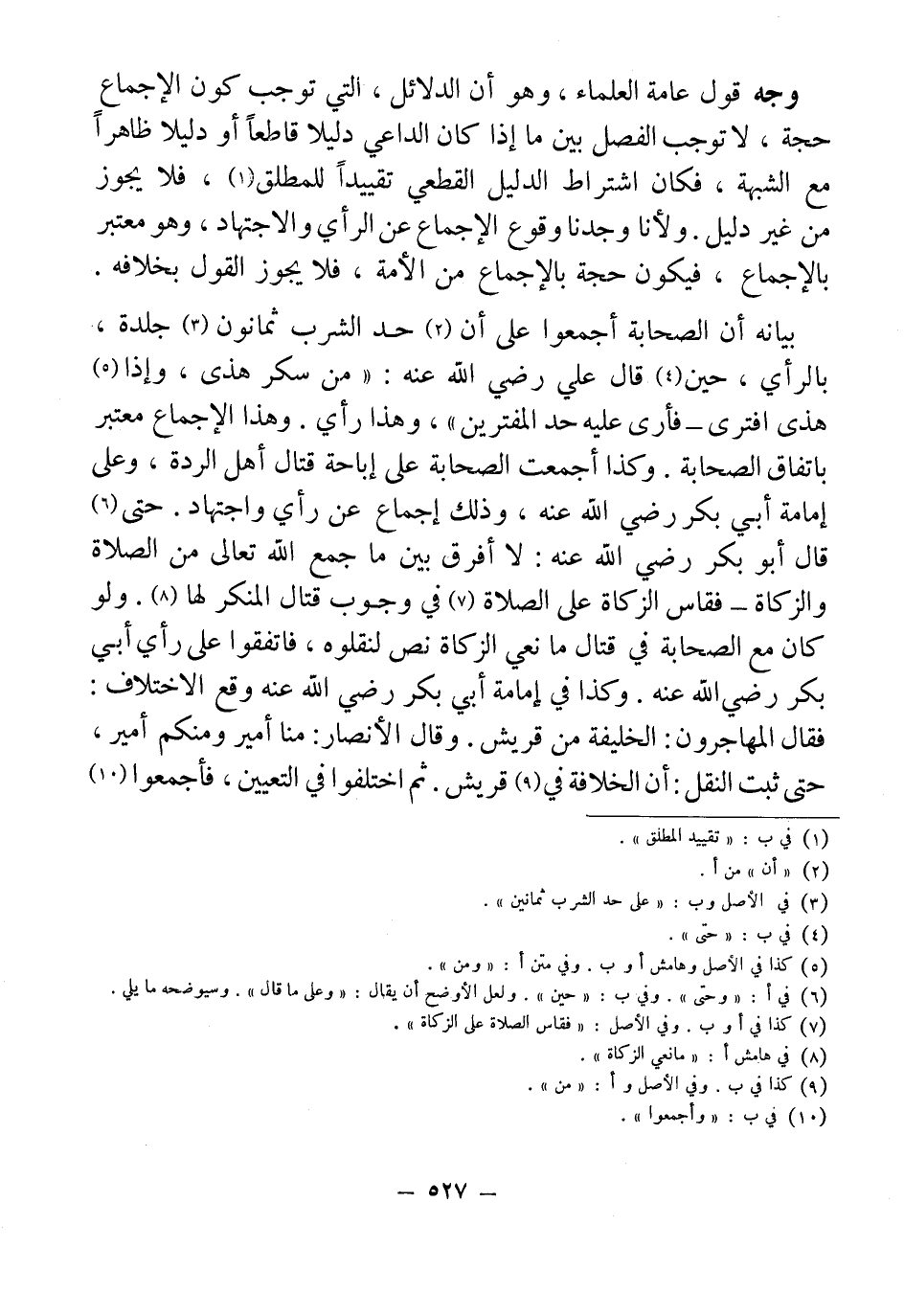 بيانه أن الصحابة أجمعوا على أن (¬2) حد الشرب ثمانون (¬3) جلدة،. بالرأي، حين (¬4) قال علي رضي الله عنه: "من سكر هذى، وإذا (¬5) هذى افترى- فأرى عليه حد المفترين"، وهذا رأي. وهذا الإجماع معتبر باتفاق الصحابة. وكذا أجمعت الصحابة على إباحة قتال أهل الردة، وعلى إمامة أبي بكر رضي الله عنه، وذلك إجماع عن رأي واجتهاد. حتى (¬6) قال أبو بكر رضي الله عنه: لا أفرق بين ما جمع الله تعالى من الصلاة والزكاة: - فقاس الزكاة على الصلاة (¬7) في وجوب قتال المنكر لها (¬8). ولو كان مع الصحابة في قتال ما نعي الزكاة نص لنقلوه، فاتفقوا على رأي أبي بكر رضي الله عنه. وكذا في إمامة أبي بكر رضي الله عنه وقع الاختلاف: فقال المهاجرون: الخليفة من قريش. وقال الأنصار: منا أمير ومنكم أمير، حتى ثبت النقل: أن الخلافة في (¬9) قريش. ثم اختلفوا في التعيين، فأجمعوا (¬10)