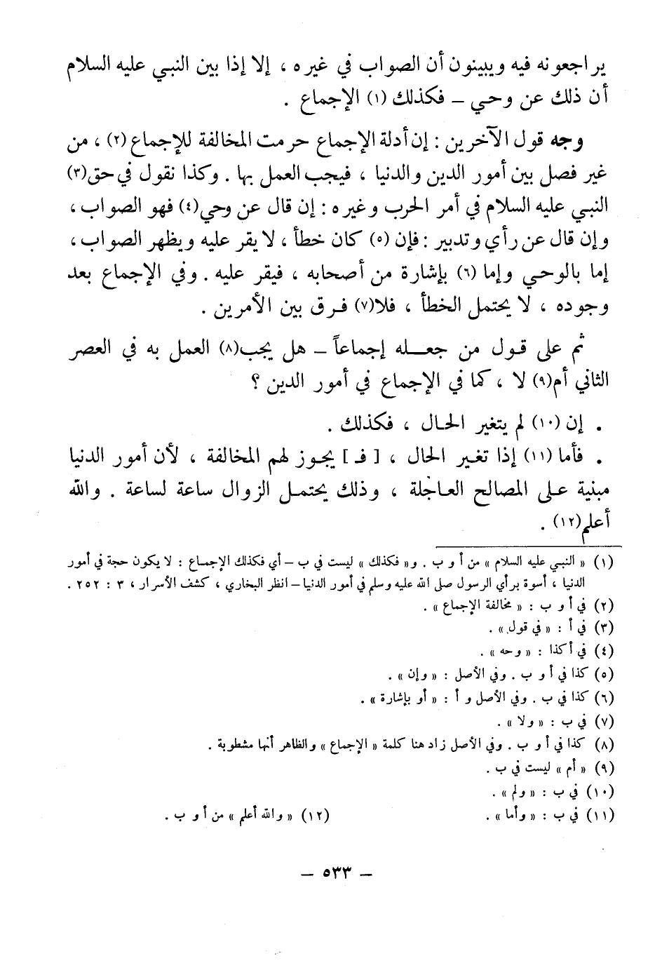 وجه قول الآخرين: إن أدلة الإجماع حرمت المخالفة للإجماع (¬2)، من غير فصل بين أمور الدين والدنيا، فيجب العمل بها. وكذا نقول في حق (¬3) النبي عليه السلام في أمر الحرب وغيره: إن قال عن وحي (¬4) فهو الصواب، وإن قال عن رأي وتدبير: فإن (¬5) كان خطأ، لا يقر عليه ويظهر الصواب، إما بالوحي وإما (¬6) بإشارة من أصحابه، فيقر عليه. وفي الإجماع بعد وجوده، لا يحتمل الخطأ، فلا (¬7) فرق بين الأمرين.