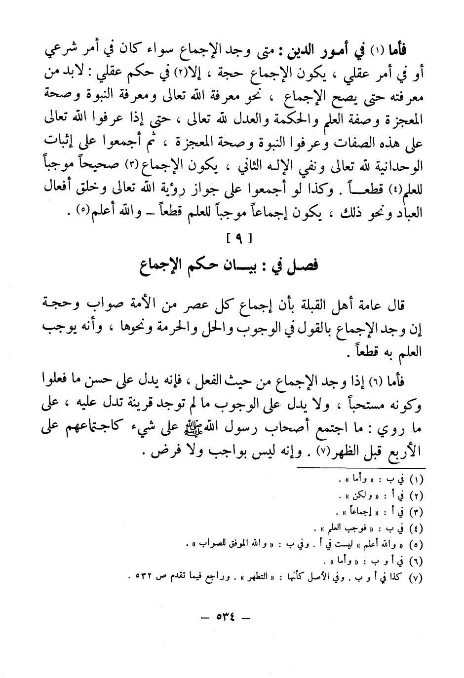 فأما (¬1) في أمور الدين: متى وجد الإجماع سواء كان في أمر شرعي أو في أمر عقلي، يكون الإجماع حجة، إلا (¬2) في حكم عقلي: لابد من معرفته حتى يصح الإجماع، نحو معرفة الله تعالى ومعرفة النبوة وصحة المعجزة وصفة العلم والحكمة والعدل لله تعالى، حتي إذا عرفوا الله تعالى على هذه الصفات وعرفوا النبوة وصحة المعجزة، تم أجمعوا على إثبات الوحدانية لله تعالى ونفي الإله الثاني، يكون الإجماع (¬3) صحيحًا موجبًا للعلم (¬4) قطعًا. وكذا لو أجمعوا على جواز رؤية الله تعالى وخلق أفعال العباد ونحو ذلك، يكون إجماعًا موجبًا للعلم قطعًا - والله أعلم (¬5).