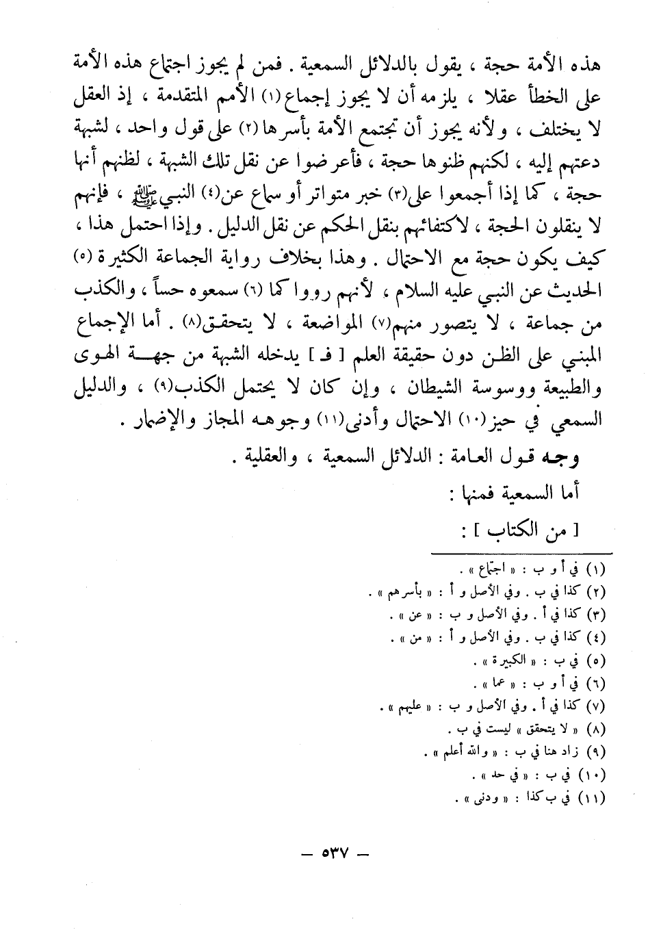 هذه الأمة حجة، يقول بالدلائل السمعية. فمن لم يجوز اجتماع هذه الأمة على الخطأ عقلا، يلزمه أن لا يجوز إجماع (¬1) الأمم المتقدمة، إذ العقل لا يختلف، ولأنه يجوز أن تجتمع الأمة بأسرها (¬2) على قول واحد، لشبهة دعتهم إليه، لكنهم ظنوها حجة، فأعرضوا عن نقل تلك الشبهة، لظنهم أنها حجة، مما إذا أجمعوا على (¬3) خبر متواتر أو سماع عن (¬4) النبي - صلى الله عليه وسلم -، فإنهم لا ينقلون الحجة، لاكتفائهم بنقل الحكم عن نقل الدليل. وإذا احتمل هذا، كيف يكون حجة مع الاحتمال. وهذا بخلاف رواية الجماعة الكثيرة (¬5) الحديث عن النبي عليه السلام،. لأنهم رووا كما (¬6) سمعوه حسًا، والكذب من جماعة، لا يتصور منهم (¬7) المواضعة، لا يتحقق (¬8). أما الإجماع المبني على الظن دون حقيقة العلم [فـ] يدخله الشبهة من جهة الهوى والطبيعة ووسوسة الشيطان، وإن كان لا يحتمل الكذب (¬9)، والدليل السمعي في حيز (¬10) الاحتمال وأدنى (¬11) وجوهه المجاز والإضمار.