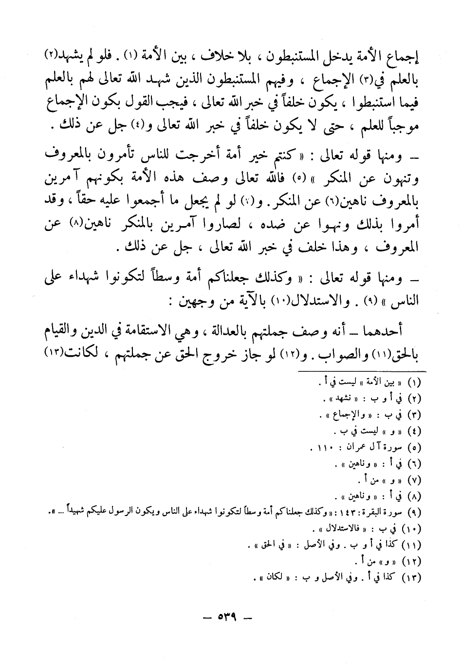 إجماع الأمة يدخل المستنبطون، بلا خلاف، بين الأمة (¬1). فلو لم يشهد (¬2) بالعلم في (¬3) الإجماع، وفيهم المستنبطون الذين شهد الله تعالى لهم بالعلم فيمما استنبطوا، يكون خلفًا في خبر الله تعالى، فيجب القول بكون الإجماع موجبًا للعلم، حتى لا يكون خافًا في خبر الله تعالى و (¬4) جل عن ذلك.
