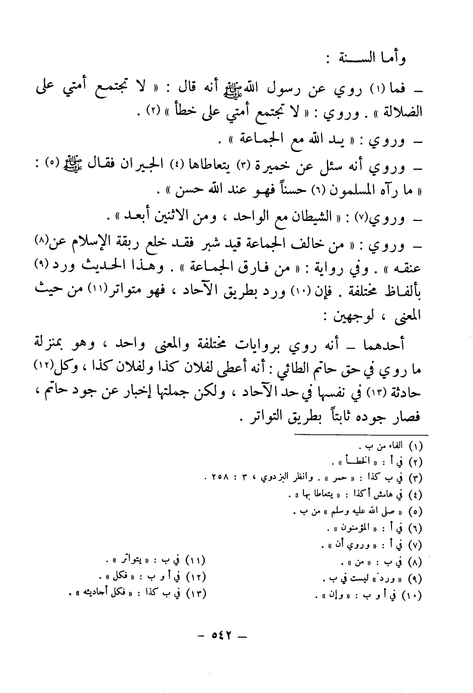 - وروي: "من خالف الجماعة قيد شبر فقد خلع ربقة الإسلام عن (¬8) عنقه". وفي رواية: "من فارق الجماعة". وهذا الحديث ورد (¬9) بألفاظ مختلفة. فإن (¬10) ورد بطريق الآحاد، فهو متواتر (¬11) من حيث المعنى، لوجهين: