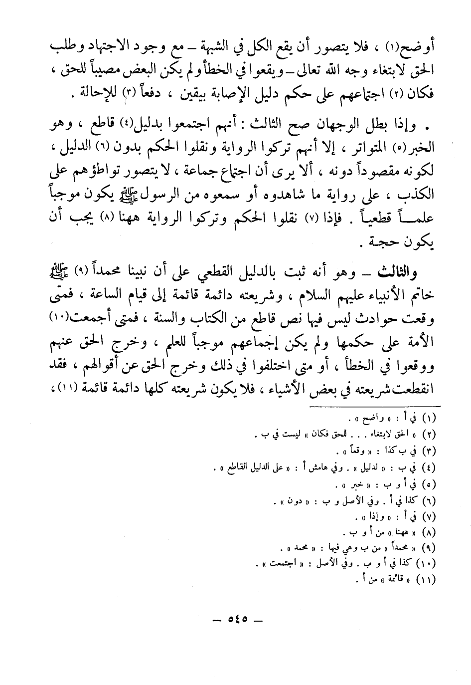 والثالث - وهو أنه ثبت بالدليل القطعي على أن نبينا محمدًا (¬9) - صلى الله عليه وسلم - خاتم الأنبياء عليهم السلام، وشريعته دائمة قائمة إلى قيام الساعة، فمتى وقعت حوادث ليس فيها نص قاطع من الكتاب والسنة، فمتى أجمعت (¬10) الأمة على حكمها ولم يكن إجماعهم موجبًا للعلم، وخرج الحق عنهم ووقعوا في الخطأ، أو متى اختلفوا في ذلك وخرج الحق عن أقوالهم، فقد انقطعت شريعته في بعض الأشياء، فلا يكون شريعته كلها دائمة قائمة (¬11)،