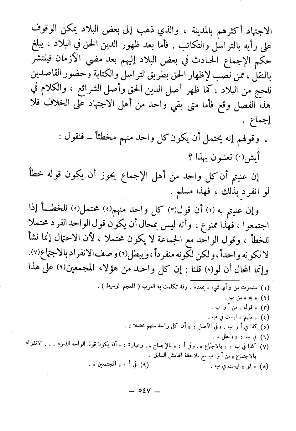 (¬7) كذا في ب: "بالاجتماع". وفي أ: "بالإجماع". وعبارة: "أن يكون قول الواحد الفرد ... الانفراد بالاجتماع" من (أ) و (ب) مع ملاحظة الهامش السابق.