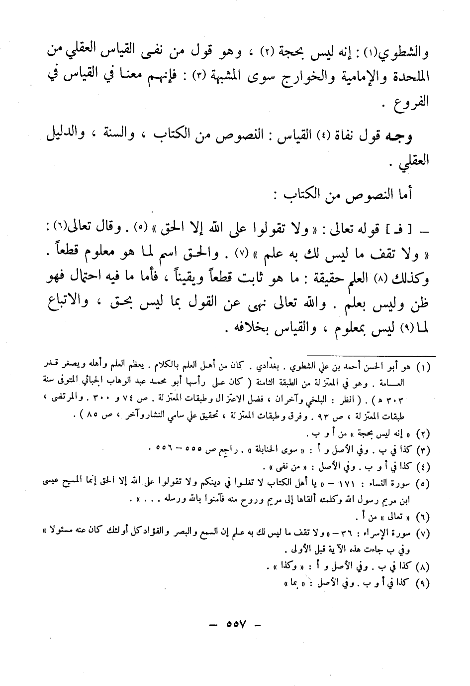 والشطوي (¬1): إنه ليس بحجة (¬2)، وهو قول من نفى القياس العقلي من الملحدة والإمامية والخوارج سوى المشبهة (¬3): فإنهم معنا في القياس في الفروع.