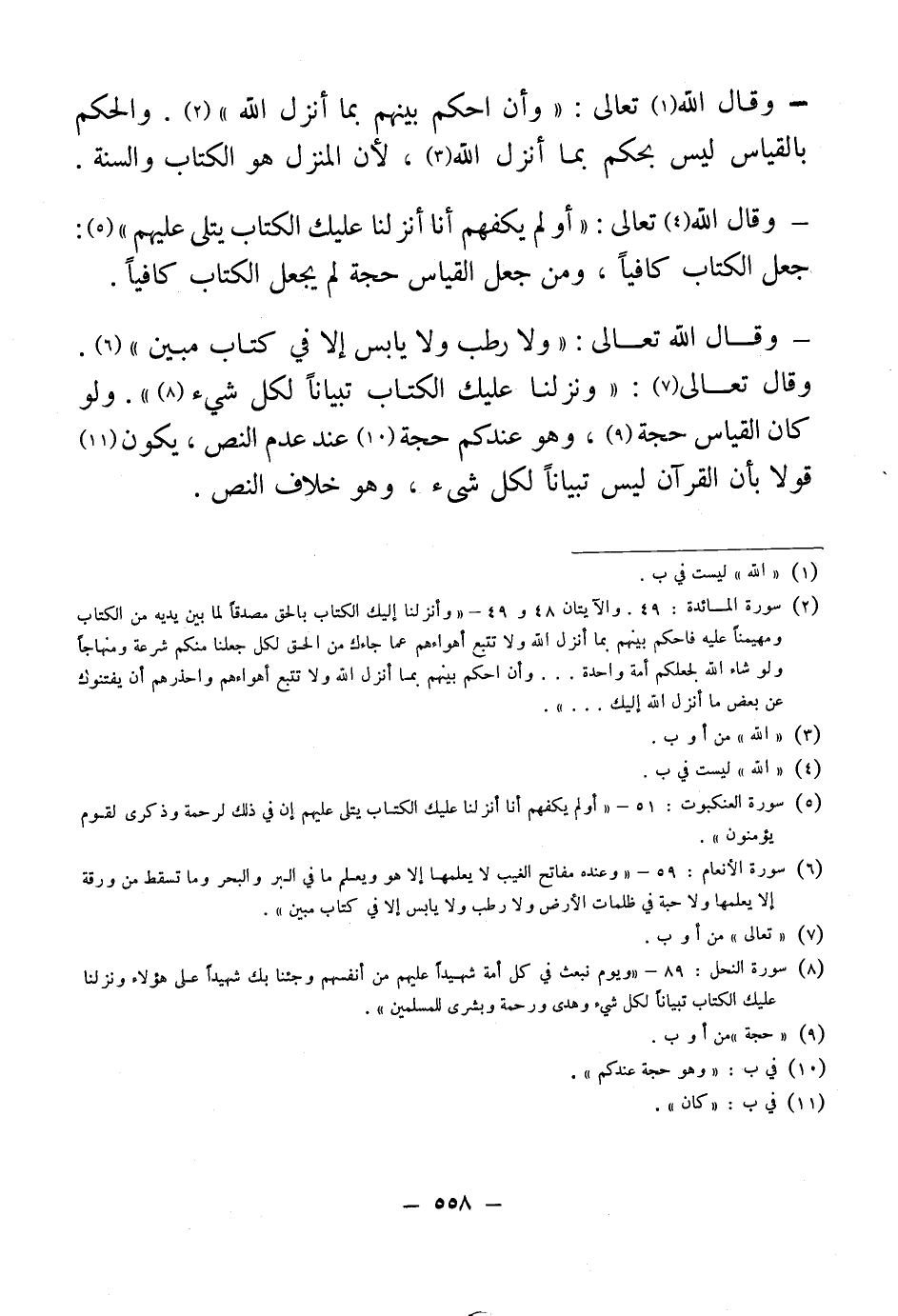 - وقال الله تعالى: {وَلَا رَطْبٍ وَلَا يَابِسٍ إِلَّا فِي كِتَابٍ مُبِينٍ} (¬6). وقال تعالى (¬7): {وَنَزَّلْنَا عَلَيْكَ الْكِتَابَ تِبْيَانًا لِكُلِّ شَيْءٍ} (¬8) ". ولو كان القياس حجة (¬9)، وهو عندكم حجة (¬10) عند عدم النص، يكون (¬11) قولا بأن القرآن ليس تبيانًا لكل شيء، وهو خلاف النص.
