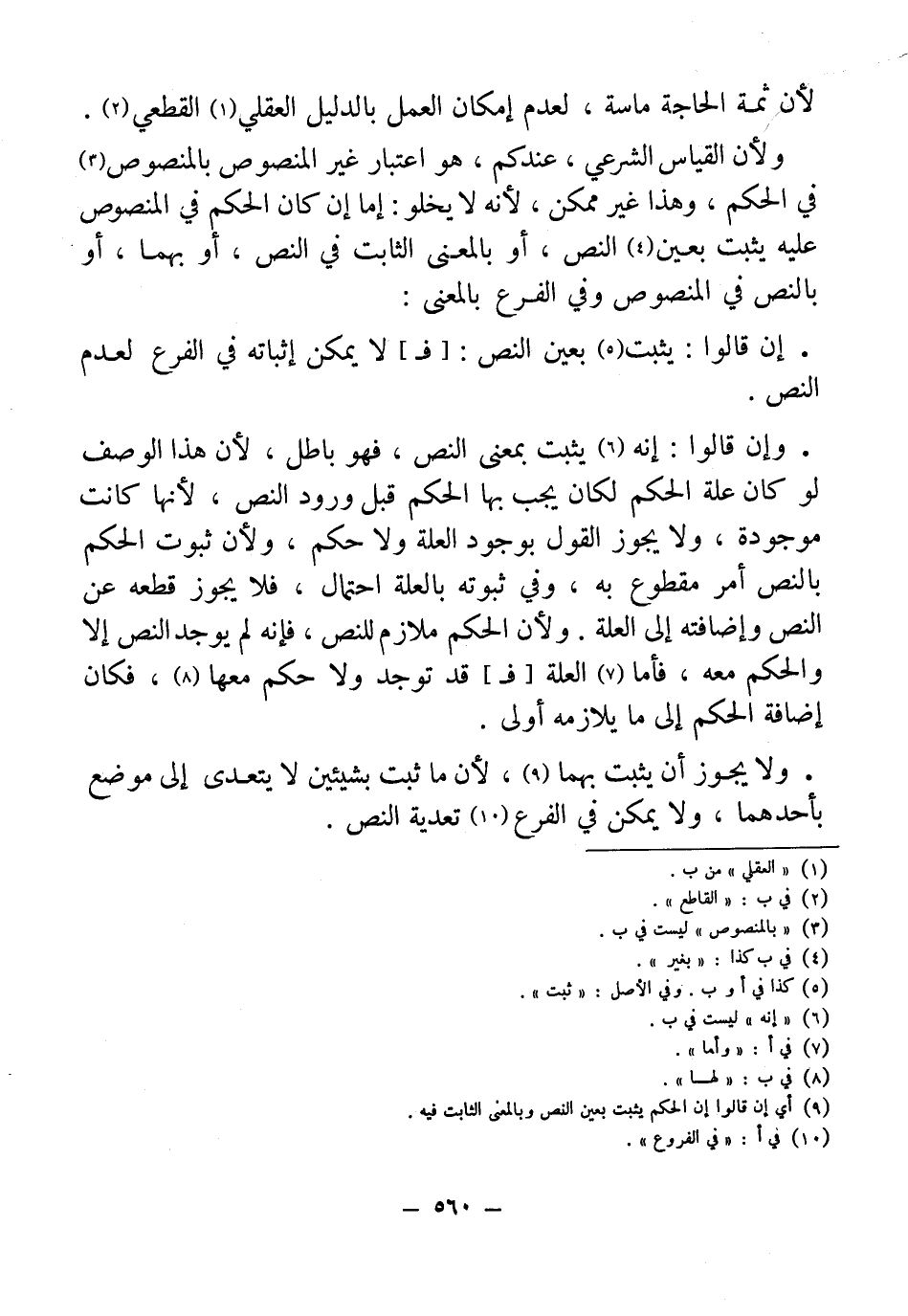 ولأن القياس الشرعي، عندكم، هو اعتبار غير المنصوص بالمنصوص (¬3) في الحكم، وهذا غير ممكن، لأنه لا يخلو: إما إن كان الحكم في المنصوص عليه يثبت بعين (¬4) النص، أو بالمعنى الثابت في النص، أو بهما، أو بالنص في المنصوص وفي الفرع بالمعنى: